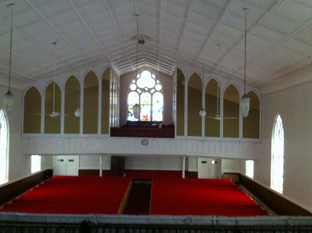 This couldn't be the 1960 Pilcher from Central Methodist, as that had 22 stops [and for a 1910s electro-pneumatic Pilcher, shouldn't they be switch-tabs?]. The facade pipes here are stencilled unlike the Pilcher ones, which appear plain in Central Methodist photos.