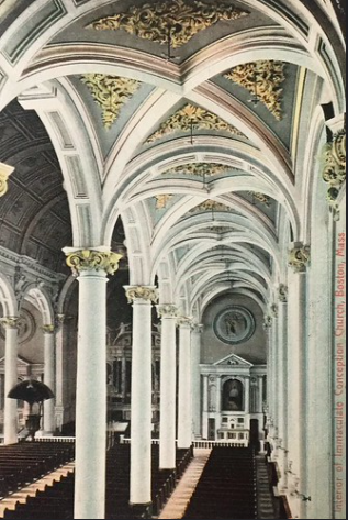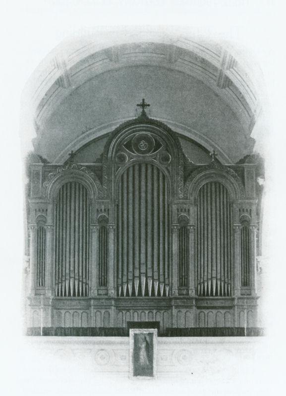 The case, designed by the builder of the church, Patrick Keeley, was not built by the Hooks, but by a separate firm. Typical for non-organbuilder constructed cases, the case was nailed, where builders would always construct their cases with screws. The facades pipes were in a tin-colored leaf, likely Palladian leaf with black ornamentation about the mouths. This can be seen in historic stereo slides of the interior. The pipes were redecorated with an opaque gold glaze. The Great action and its couplers were fitted with a Barker machine assist- likely the first for Hook, and the console, typical for large Catholic churches, was detached and reversed so the organist faced the altar. The organ had two pressures, 3" for the manuals, 3 1/2" for the Barker machine and Pedal division. The organ was built during a period of adversity for the Hook firm, with almost the entirety of the staff away at War, and the remaining group, probably about 15 or so older men, disabled, or immigrants managed to construct this monumental organ at a time that there were constant material shortages.