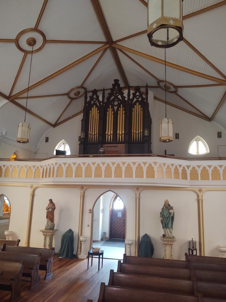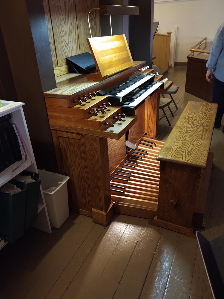 After being derelict for many years, the organ was renovated by David Storey of Baltimore. Bellows, now single rise, was releathered, new blower added, All pipes cleaned, missing and spurious pipes were replaced with pipes from other derelict Pomplitz organs in Baltimore. A new electric console was built and attached to the front of the case in the location of the original. This was accomplished in 2012. The organ remains with electro=pnuematic pull down action and electric stop action with a simple combination action. Pedal stops were increased to 30 notes and a BDO scale pedalboard was used in the new console. The manuals are of 58 notes.
