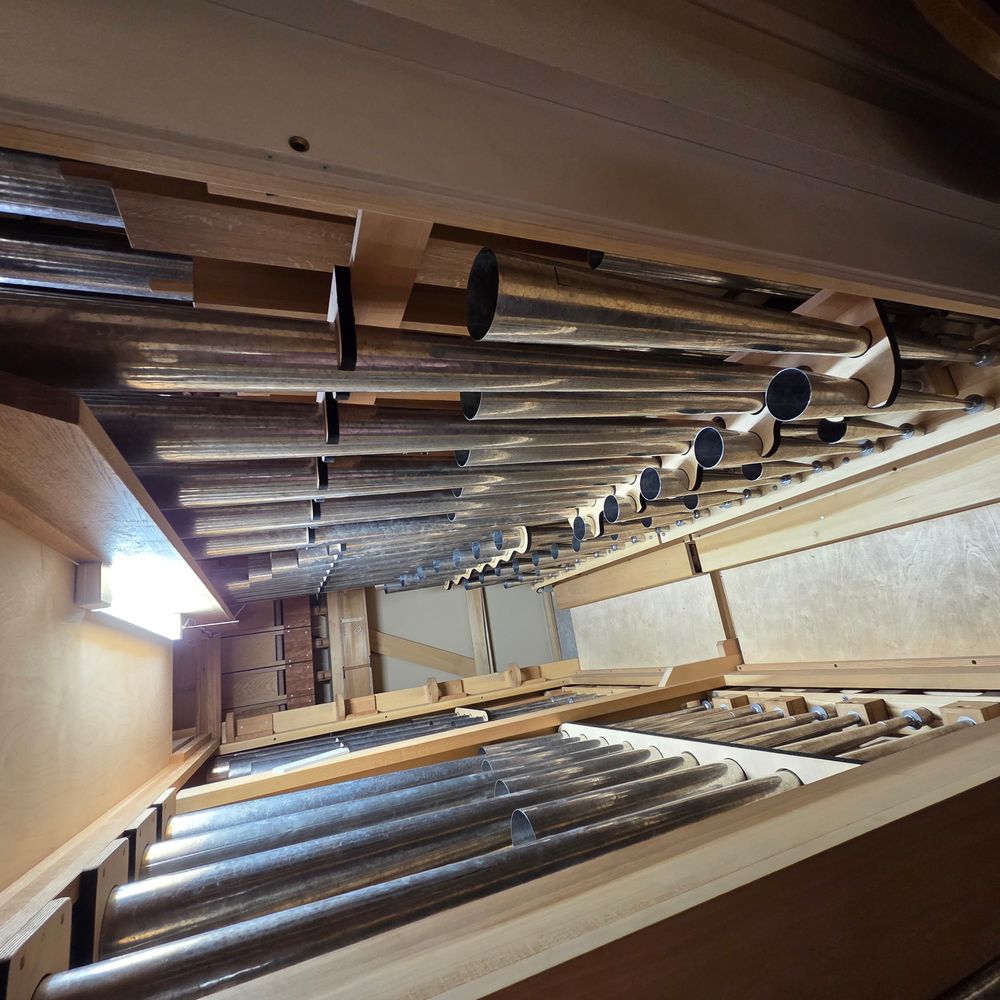 -The Zimbelstern from previous Wicks organ was kept by request of the church. It is now called "Clochettes" -The Trompette 8' and Clairon 4' of the pédale are shared mechanically with the use of back-check valves