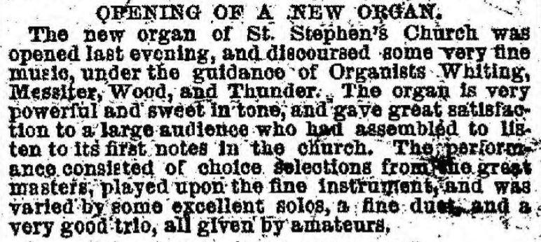 “The old organ in St. Stephen' s Church was, like others mentioned above, cased in harmony with the church interior and was otherwise an instrument worthy of the ability of the organist (David D Wood) who graced its console for almost half a century. It was built by Simmons and McIntyre, a Boston firm, whose reputation could have rested on this instrument alone. Among the beautifully voiced stops that imparted high quality to their work was a "Tenoroon Hautbois" on the upper manual, and on the lowest manual another read stop, the “Corno di Bassetto”, much favored by Mr. Wood, also a string-toned register, the “Keraulophon” which had been invented by the eminent organ builders Gray and Davison of London, about twenty years before. Its inclusion in St. Stephen's organ evidenced the progress in organ building then taking place in our country. Many of the stop combinations were rich, and the full organ ensemble very brilliant; Mr. Wood having the rare ability to discern the many hundreds of varieties of tone at command in a good organ - a marked contrast to the general character of organ tone where the player is content to use but few of the possible combinations that lie dormant in his instrument. “