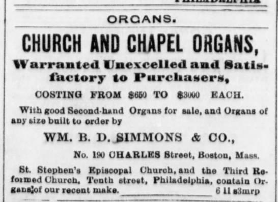 In May 1864 the Committee reported it adopted the plans submitted by a “Mr. Simon of Boston” (William Benjamin Dearborn Simmons) for a pipe organ costing $4000. The Committee recommended that the old organ be repaired and purchased for the Burd Orphan Asylum’s chapel. The organ was of 3 manuals with a "full pedal-board". Replaced in 1907 by a large, 4 manual, electropneumatic action C.S. Haskell organ.