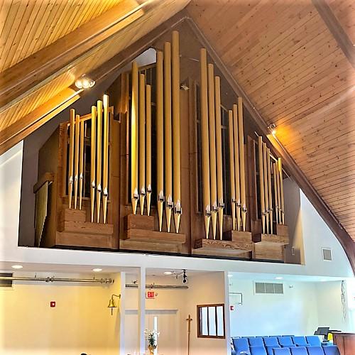 From the builder's website: This new pipe organ for Emanuel Lutheran Church in Fitchburg Massachusetts contains 2 manuals and 20 ranks with electric slider windchests. All mechanicals including winding, 2 inch thick expression enclosures for the Swell AND Great was constructed by our staff and is located behind a Frank Friemel designed case that fits this small post-modernist 1970’s building. Aside from the new façade Pedal Violone and reeds, all fluework will be from the church’s existing Hook and Hastings (1896 Opus 1127 originally built for the Calvinistic Congregational in Fitchburg) and is augmented with pipework from E.& G.G. Hook (1872 Opus 616- Kinsley voiced).