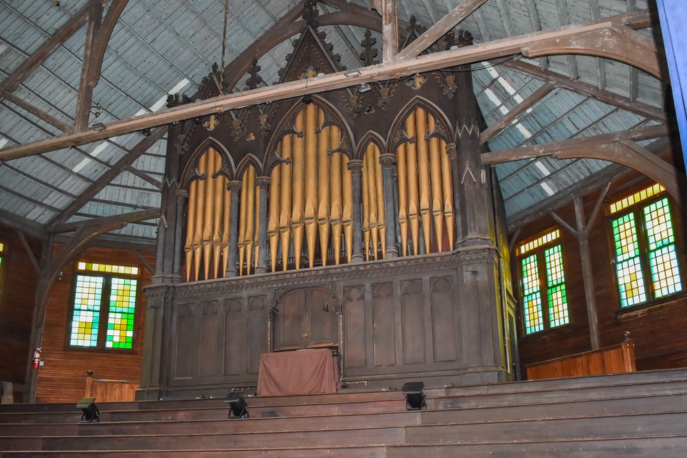 Updated through on-line information from James R. Stettner. -- Originally a G-compass organ. Converted to C-compass by Levi U. Stuart in 1868. Original Great 4' 2nd Principal later replaced with with an 8' string. This tonal change reversed by Andover Organ Co. with a used Ferris 4' Octave in 1988. 5-sectional facade with 23 gold-painted pipes arranged: 5-3-7-3-5. Drawknobs arranged in cruciform layout on each side of the manuals.