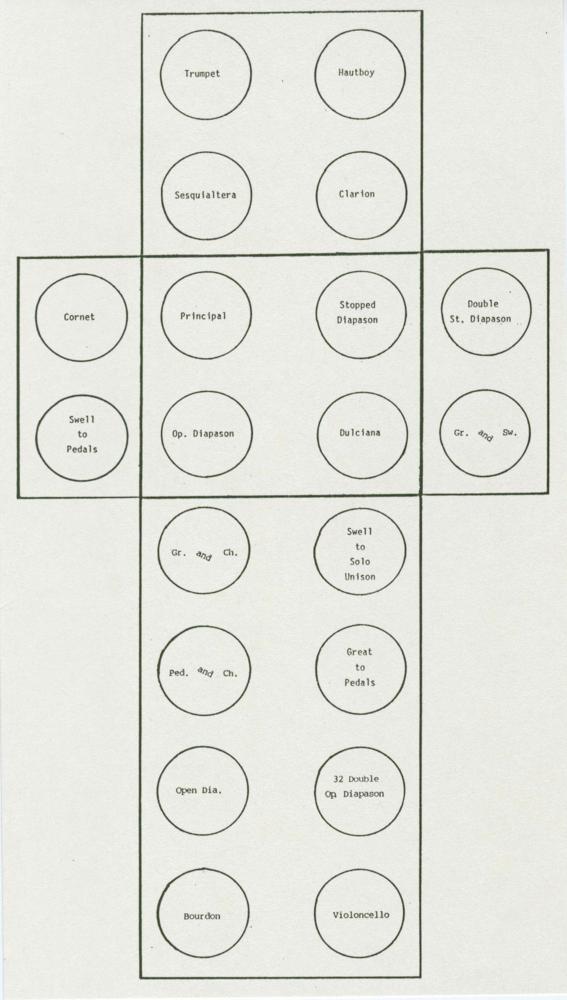 Updated through online information from John Walthausen. -- n.b. the second principal 4 on the great which was changed to a salicional in the 19th century has since been changed back to a principal by Andover.