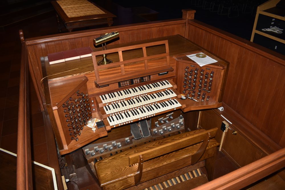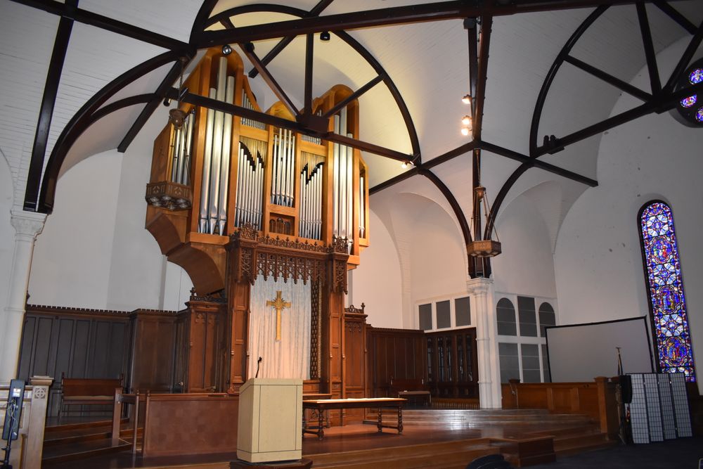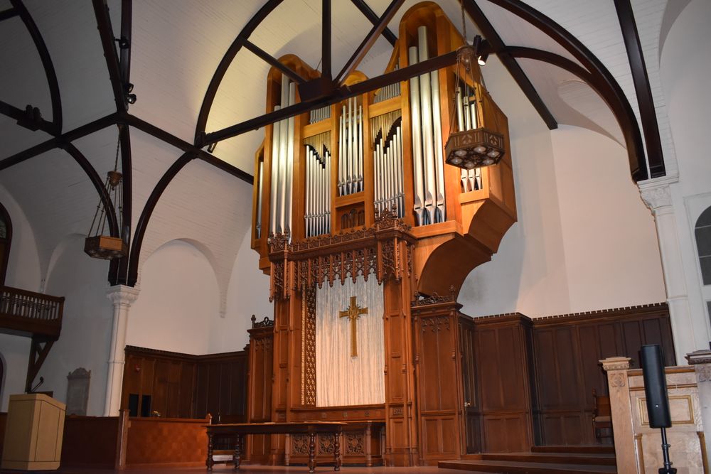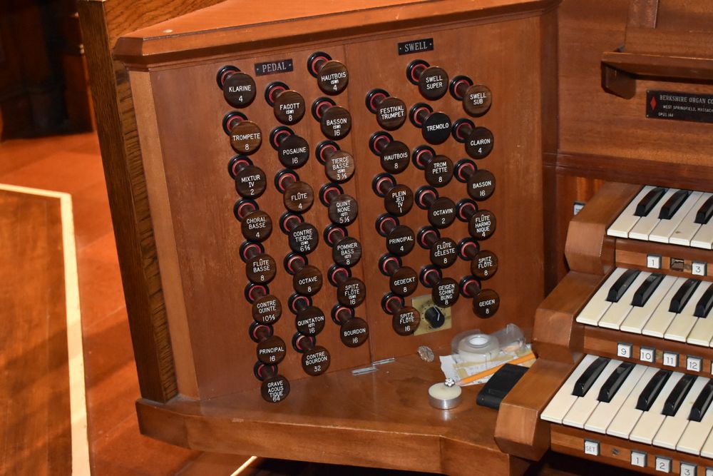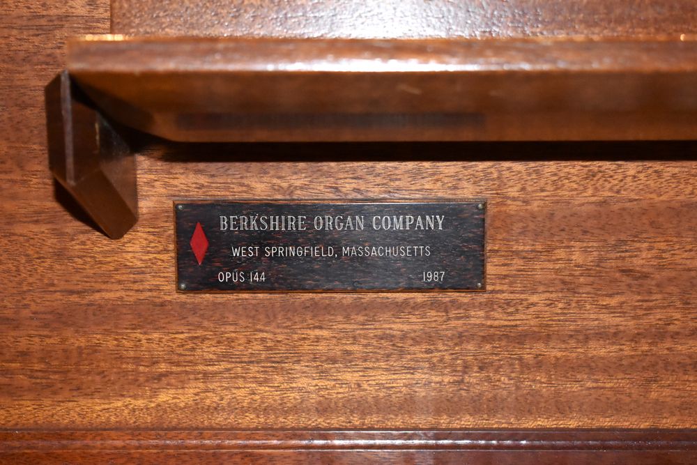 The instrument is a rebuilding and enlargement of the 1958, 3/49 Schantz Organ Co. Opus 352, which was relocated from the Chestnut Street Congregational Church in Worcester (OHS Database ID# 48050) when that churched merged with the Central Congregational Church to form the United Congregational Church. The present organ has electro-pneumatic wind chest. It is a 3 manual and pedal organ with 54 ranks and 2922 pipes. The 1987 Berkshire organ replaced the 1958 Austin Organs, Inc Opus 1804-R, which is no longer extant. (OHS Database ID#s 53728 and 12665) The organ is currently not in regular use but was played on 2-27-2024. It is playable but needs tuning.