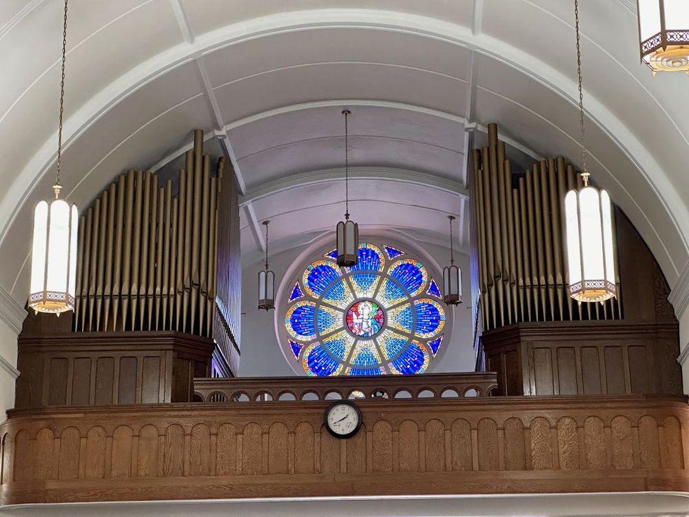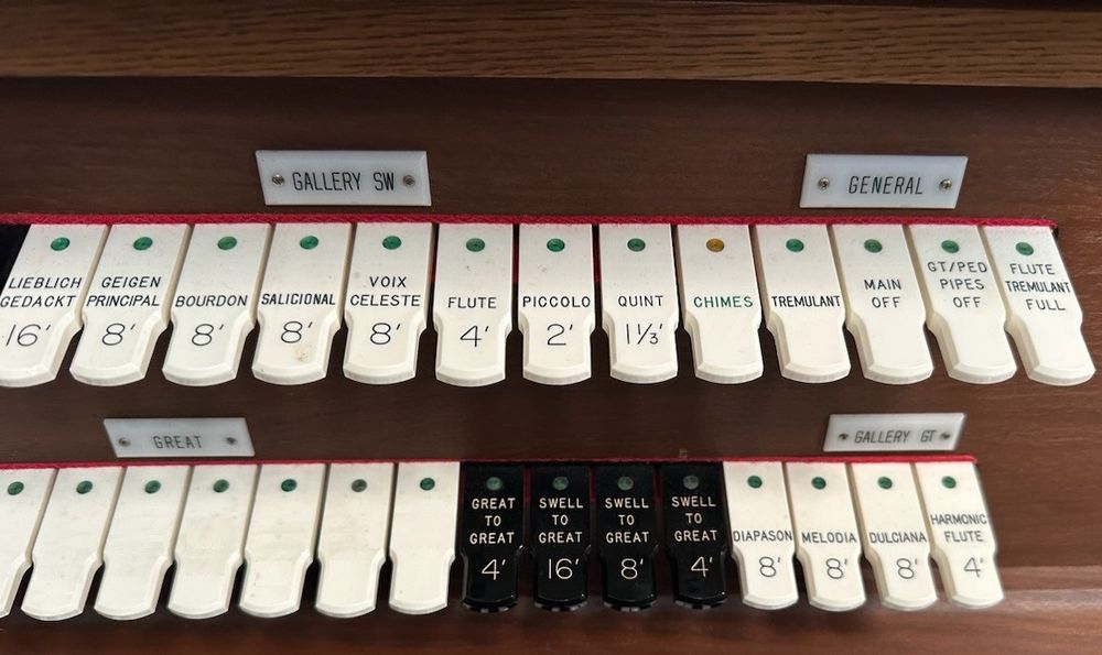 Updated through a text message from Nate Pultorak to James R. Stettner on Sept. 14, 2024: The original console is gone and the organ is now a Tellers-Rodgers hybrid with the Gallery division playing the Tellers pipework.