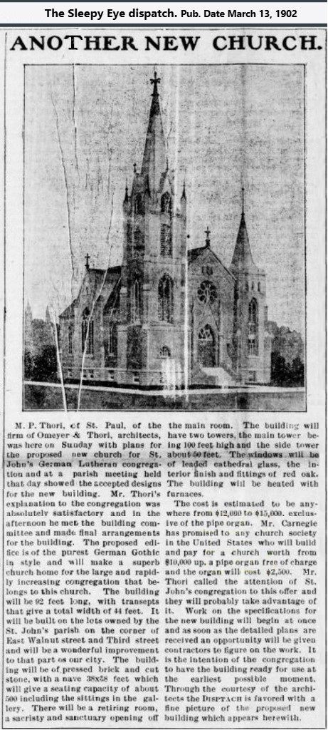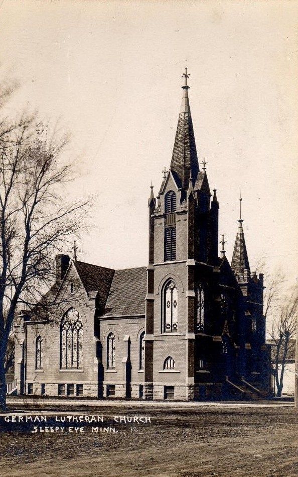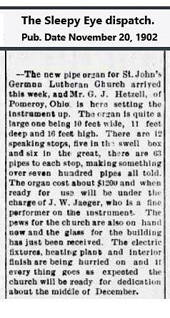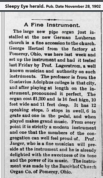 According to a 1902 newspaper article in the Sleepy Eye Dispatch about the planned construction of the church, the organ cost a total of $2,500, half of which seems to have been covered by a grant from Andrew Carnegie. Newspaper articles from November of that year state that the organ was built by the Barckhoff Church Organ Co. of Pomeroy, Ohio. A February 7, 1919 tidbit in the Sleepy Eye Herald-Dispatch states that an electric blower would be installed for the organ at some point during the year of 1919, at a cost of $375. This organ was rebuilt in the summer of 1927, and was replaced in late 1946 by a Wicks organ.