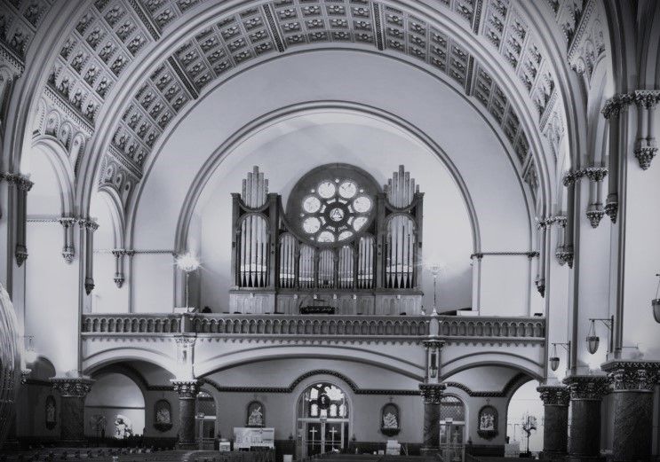 According to the contract, the organ's facade pipes were "Aluminum - decorated.". It reads "Tubular Pneumatic Action throughout." And while it specifies a water motor, it also notes that a "wheel or handle must be provided to work the bellows by hand, if motor should get out of order." The oak case (which still exists, fronting a 1924 Kilgen, OHS #8603) was to be built "according to the Architect's design."