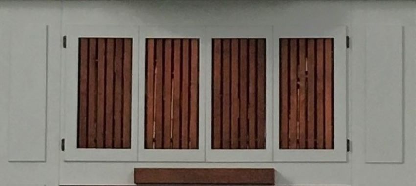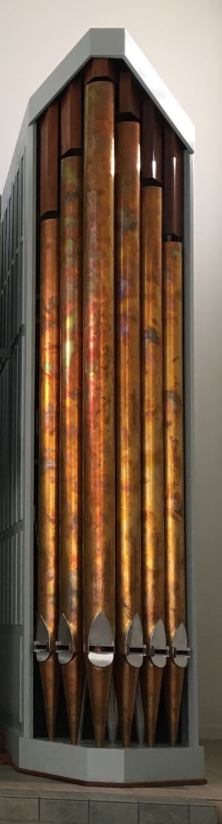 "Opus 27 is a three-manual instrument, meaning it has three keyboards and a pedal board. Each keyboard is used to play a different set of pipes: the Great division, the Swell division, or the Continuo division, along with the Pedal division (played by the feet on the pedal board). The Great division is located directly above the key desk where its facade pipes (the 8' Prestant rank of polished tin) are visible. To the right of the Great division is the Pedal tower with its flamed copper facade pipes (the 16' Prestant rank). The Swell division, which is enclosed ("under expression") behind movable louvers to control volume, is located behind the Great division. The Continuo division is located just above the key desk and music rack behind small louvered doors that can be opened or closed manually to control volume."
