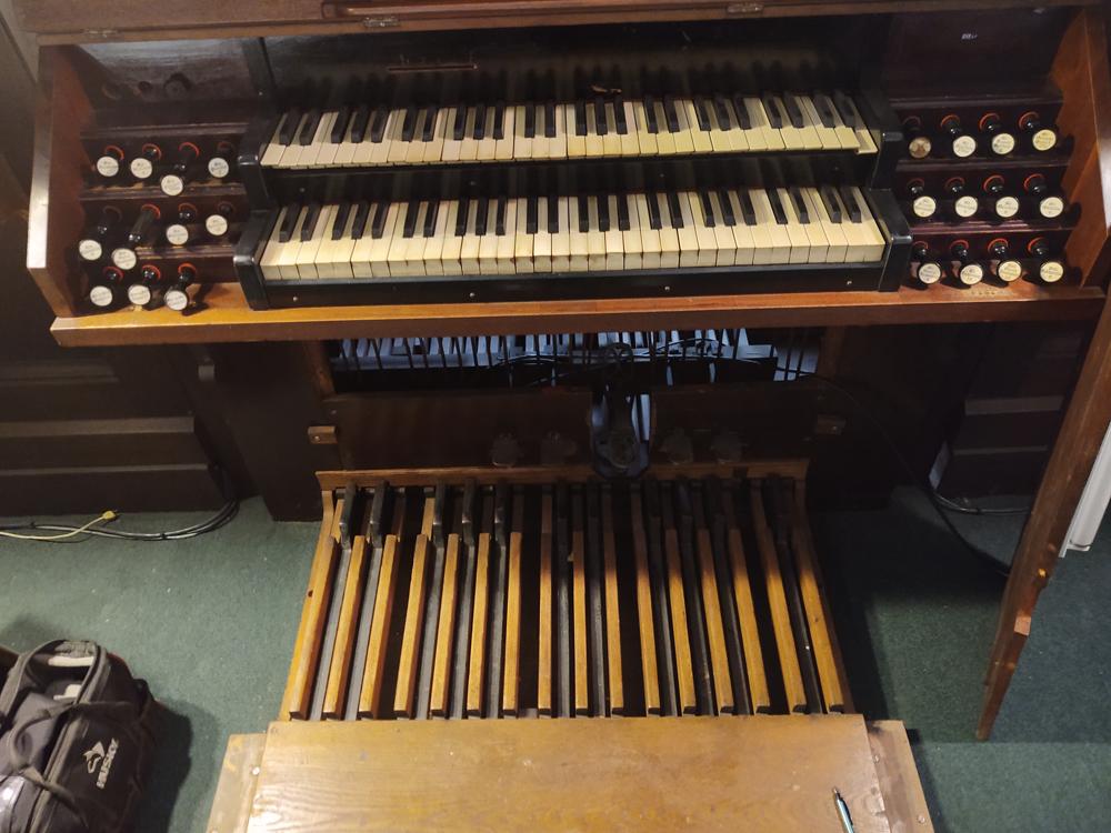 1997 Hilbus Organ Crawl. Compass 58/27. Foot pedals pull preset combinations.