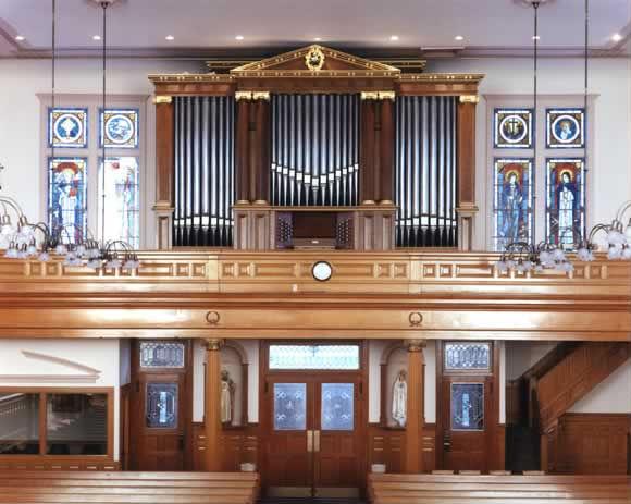Uses 16 ranks from an 1881 Bergstrom organ, built for Taylor St. Methodist, Portland, OR which was later electrified at Willamette University, Salem, OR. Purchased and stored by Archdiocese of Portland. [Replaced a 2m. c. 1929 Kilgen, Op. 4119, model U3, rebuilt & enlarged by Bond c. 1983. Sanctuary and organ burned 1993.]
