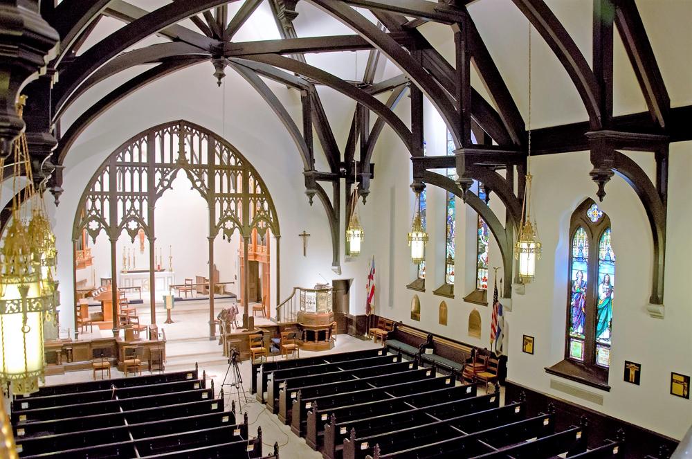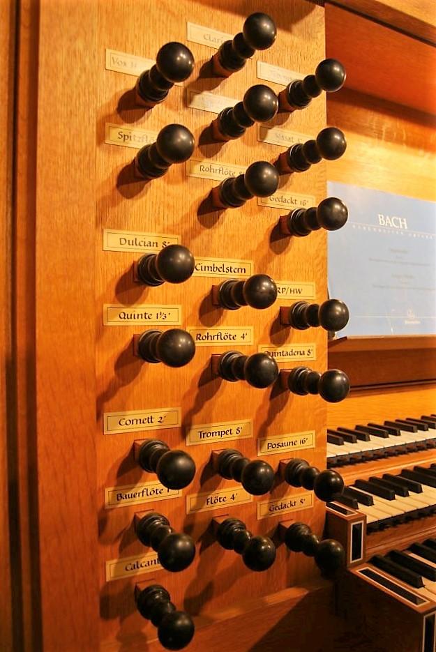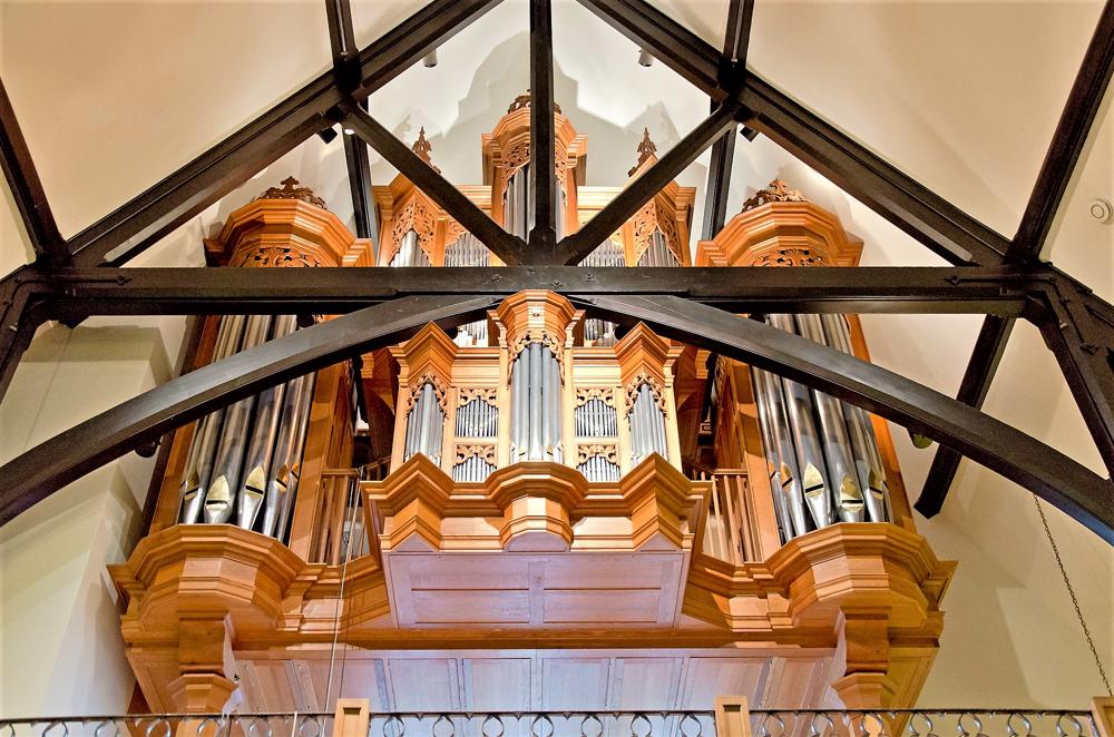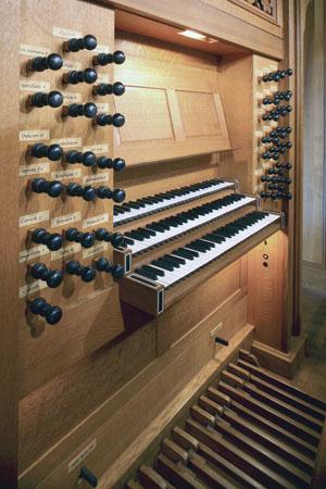 On September 20, 1992, a new organ was dedicated in a rear gallery of the Cathedral with two identical recitals by Peter Hurford. The three-manual, fifty-rank organ of mechanical key and stop action was built by Taylor & Boody Organbuilders of Staunton, Virginia, as its opus 19. Manual compass is fifty-six notes (CC-g3); pedal compass is thirty notes (CC-fl). The temperament is after Kellner (Bach). The metal pipes are of hammered lead-tin alloys. The fapde pipes are of 98 percent lead; interior pipes are of 28 percent tin alloy. The case and the supporting gallery, specially designed for the organ, are of solid white oak. There are 2,454 speaking pipes (and 46 dummies). While the Wolff organ is built in an English/French style, the gallery organ represents the Northern European tradition. Wind is supplied by three bellows mounted in a rack in the tower. Wind may be raised by electric blower or by foot power. -- *2007 OHS Atlas*