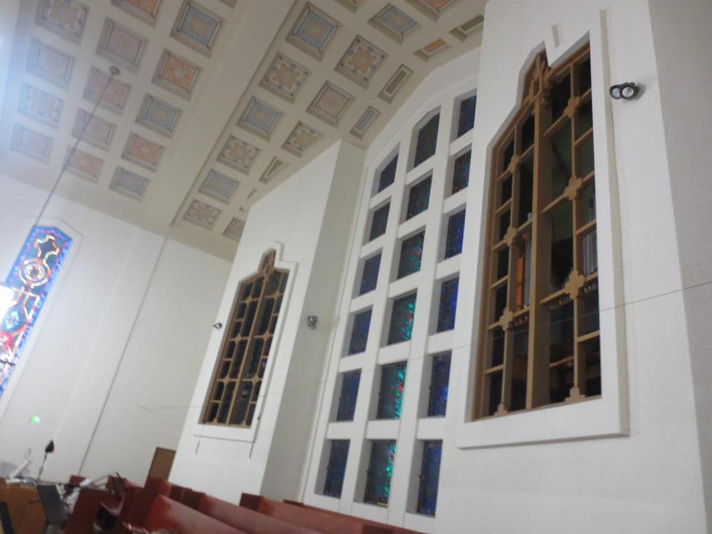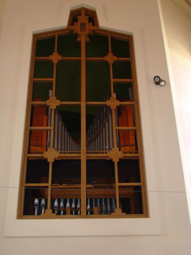 Updated through online information from Steven Ottományi. -- The two-manual and pedal console faces the rear of the church and has stop tabs and no rolltop. The pipes reside in two chambers recessed into the slightly canted rear wall, with minimal grills covering the openings. The tops of each chamber are angled at 45 degrees to aid sound projection. Facing the back of the church, the Swell division is in the left chamber and the Great and the independent Pedal stops are in the right chamber. In spite of the depth of the chambers, projection is excellent into the nave thanks to extremely favorable conditions: marble wainscoting on all walls one fourth the way up to the ceiling; the rest is cement, sealed and painted white. The coffered ceiling rises eighty feet above the floor of the nave in the center, and approximately seventy feet at the walls. Inside the recessions in the ceiling are multi-colored ornamented, sound reflective tiles. Stained glass windows are rather narrow. Seating capacity is 1,200.