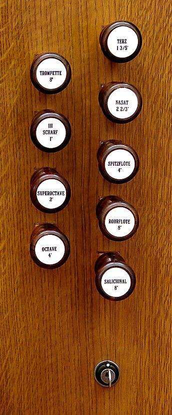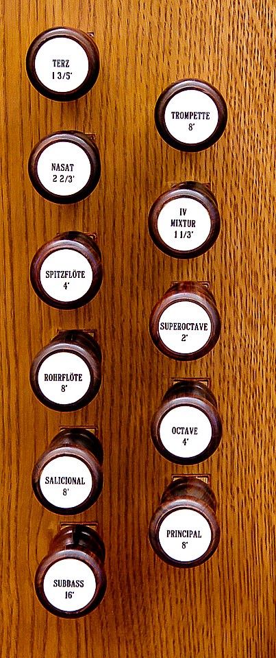 Manual stops except Mixture and 8' Principal are playable from both manuals. 8' Principal in facade. Rest enclosed. Compass 56/(30?).