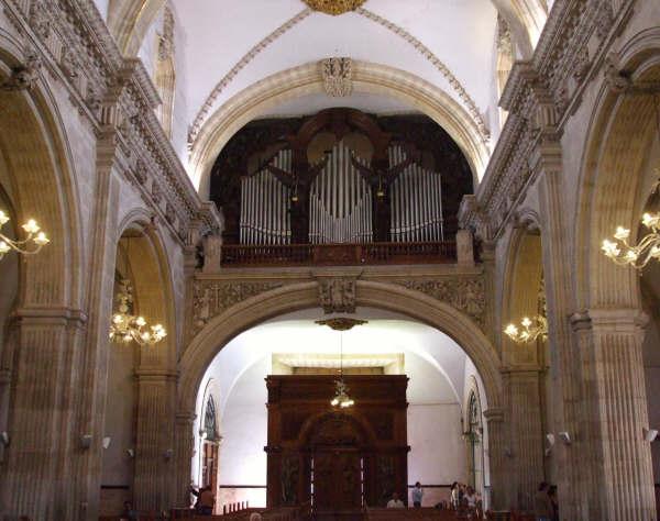 Updated through online information from Bob Knight. <br>No parts exist from the previous Hook and Jardine organs. Current instrument was installed in 1955 by Alfredo Wolburg, who was the Mexico representative for E.F. Walker and Cie at the time. Wolburg used most of the ranks and the bass chests of the 1920 Robert Morton 3/14 Style 300 installed in a Mexico City movie theatre in 1920. <br><br>The reeds were revoiced with thinner tongues on (much) lower wind pressure, the flues were revoiced with opened toes, and in some cases re-scaled. The Tibia was remade into a "Flauto Tapado" (Stopped Flute) by having the cut up lowered and the mouth narrowed with new pieces of wood glued into the pipes. The balance of the pipework was new Walker pipes which appear to have been manufactured by Lauhkuff. New Walcker wind chests were supplied for the manual divisions, with the Great having rather complex duplex chests to borrow the stops on the Great. The Robert Morton bass and offset chests were rebuilt with Laukhuff electro-mechanical primaries. The regulators and tremulant appear to be Robert Morton. <br><br>The console was new in 1955 and is installed in reverse orientation in the front of the façade, Swell shades are the Robert Morton swell shades with a new trace rod and mechanical linkage to the swell shoe, undoubtedly the only set of mechanically operated Robert Morton swell shades that have ever existed. <br><br>The façade was designed by a priest of the diocese and was built by a local carpentry firm, the quality of the carving is quite good. The balance of the organ "case" is a free standing brick structure in the choir gallery. According to the Cathedral organist, Jose Farfan, whose Uncle was Cathedral organist before him, the Hook organ suffered extensive termite damage and was completely discarded in 1955.