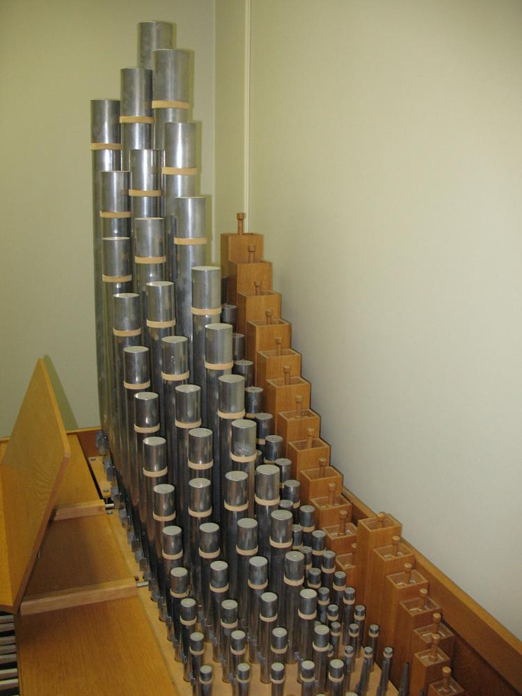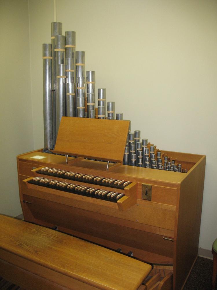 Practice organ. Manual I - 4' Rohrflote, Manual II - 8' Gedackt, Pedal - 8' Holzgedackt.