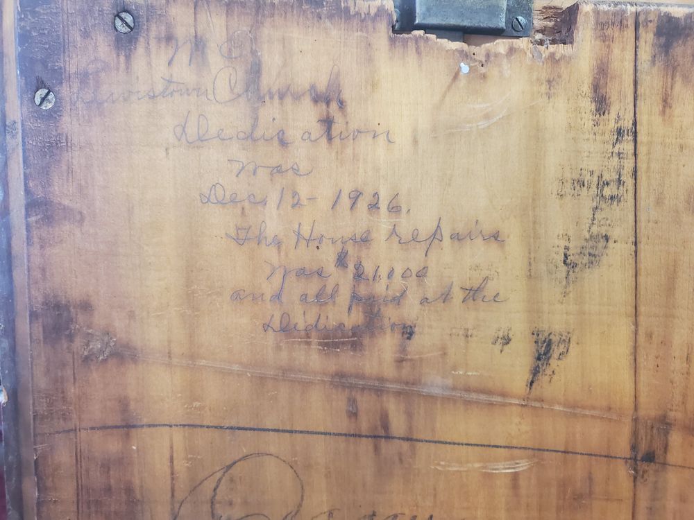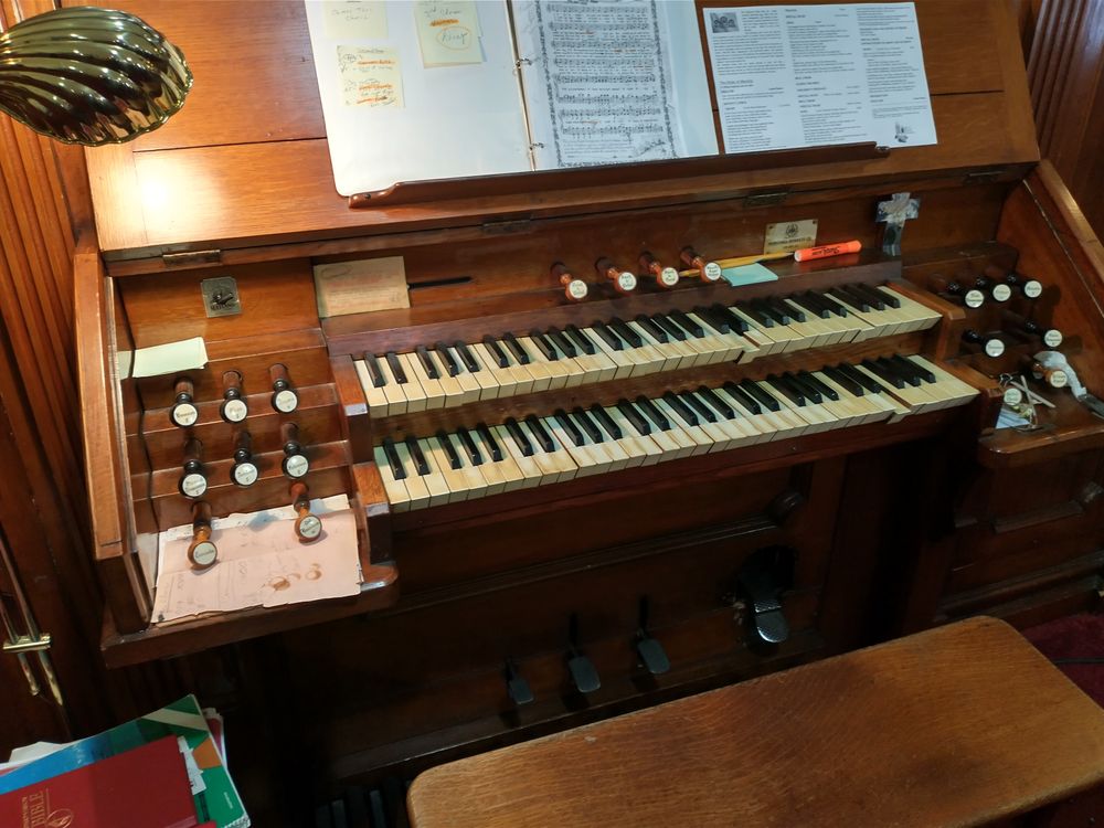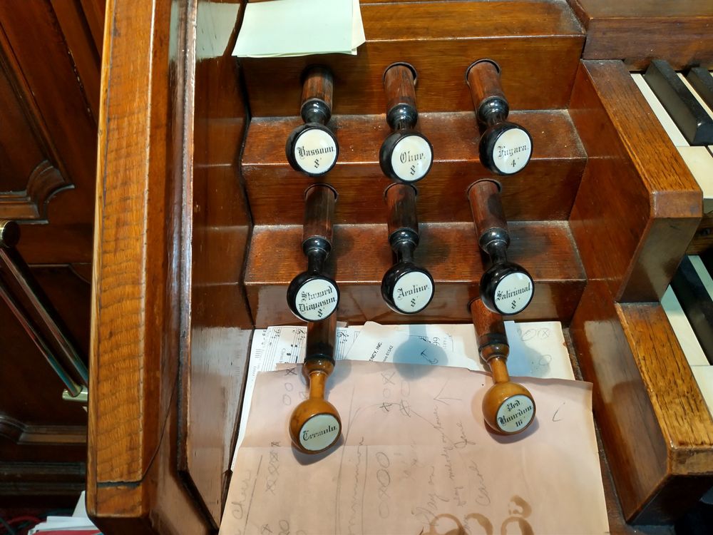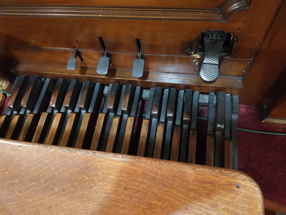 FOOT LEVERS: Gr. to Ped. (rev); COMPOSITION TRUNDLES: Piano, Forte; PEDAL MOVEMENTS: Swell expression (balanced).
