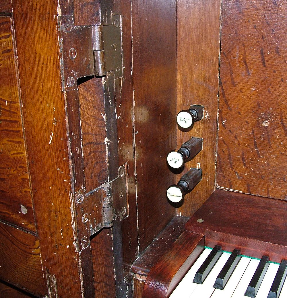 Updated through on-line information from Paul R Marchesano. -- From A. M. E. Church, Hollidaysburg, PA in 1997. Has original pump handle and can be hand-pumped. Stop action is spring-loaded, hitch down to lock in on position. There is a hitch-down, spring-loaded composition pedal which turns off all but the two 8' stops while it is held down. Wood-grained case, gilded, half-round wooden dummy facade pipes. Stops: Dulciana [8], Flute 8, Octave 4, Flute 4, Piccolo 2. Most pipework original, some replacements for missing pipes were made.