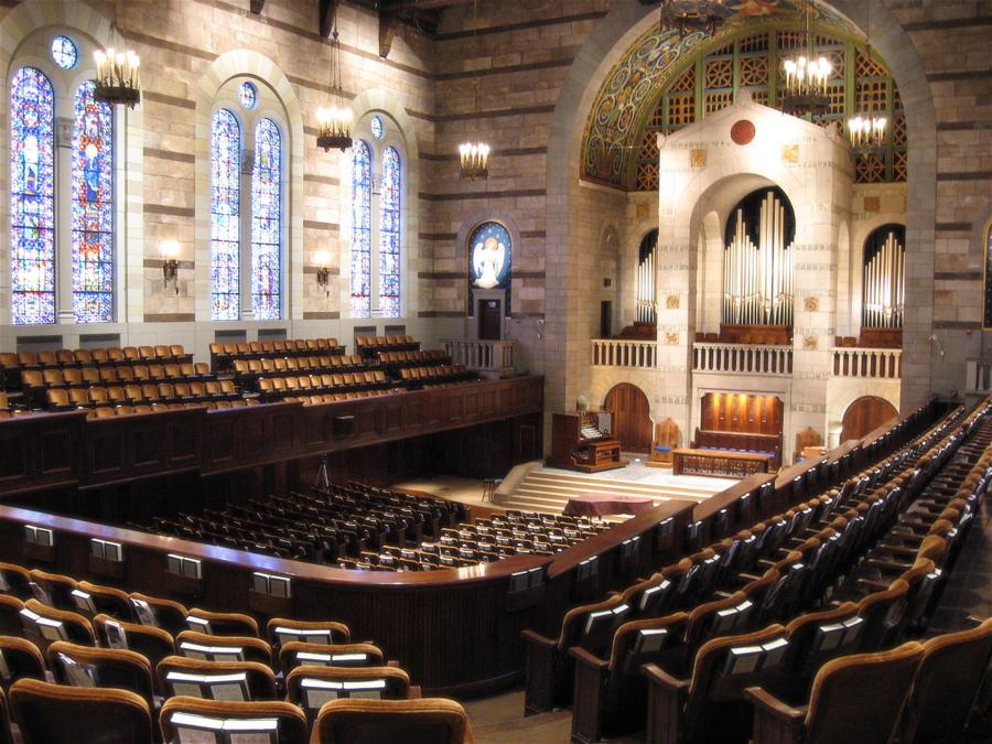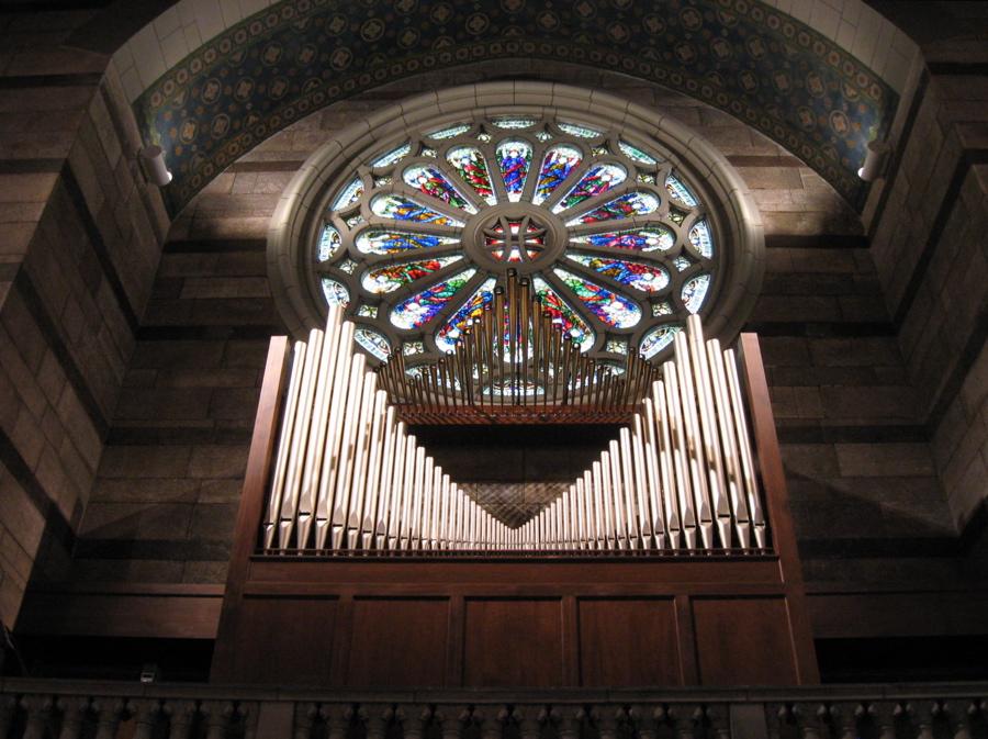 The organ's main pipe chamber is 39' wide, 40' tall, and 10' deep. The organ includes pipework from the builders who created and rebuilt the previous instrument (Skinner, Casavant, and Tellers).