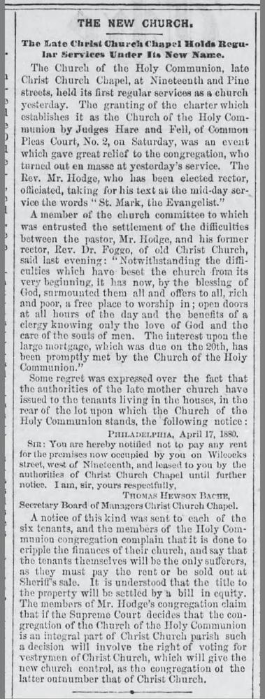 Identified from Good Friday reports and listings, a single reference: "The new organ at Christ Church Chapel is now in position, and will be played upon Easter Sunday for the first time." -- The Philadelphia Inquirer (Philadelphia, Pennsylvania), 08 Apr 1882, Sat, Page 2.