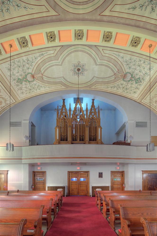 Undergoing renovation by David Storey in 2001. Reinstalled the 8' open wood pedal pipes (original windchest and action were still there).