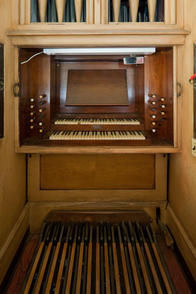 The Roosevelt-style wheel and feeder bellows remain with the organ but are not functional. The tremolo was removed, perhaps for repair, in 1993 and is missing; its stop mechanism is disconnected. The case is walnut but has been painted a cream color with wood graining on the panels. The drawknobs, attached to square shanks, are elegantly turned, with ivory color discs engraved with the stop names inserted in the face of the knob (many are missing). These are arrayed in two vertical rows, diagonally offset from each other, to either side of the keyboards and music desk. The keydesk is recessed into the case and the Swell keys do not overhang the Great. A set of sliding doors encloses the keyboards. The keyboards do not overhang the pedal keys, which are aligned in a manner sure to confound a modern organist unfamiliar with the arrangement. The original hitch-down swell lever is to the right of the pedalboard. -- *2011 OHS Atlas*
