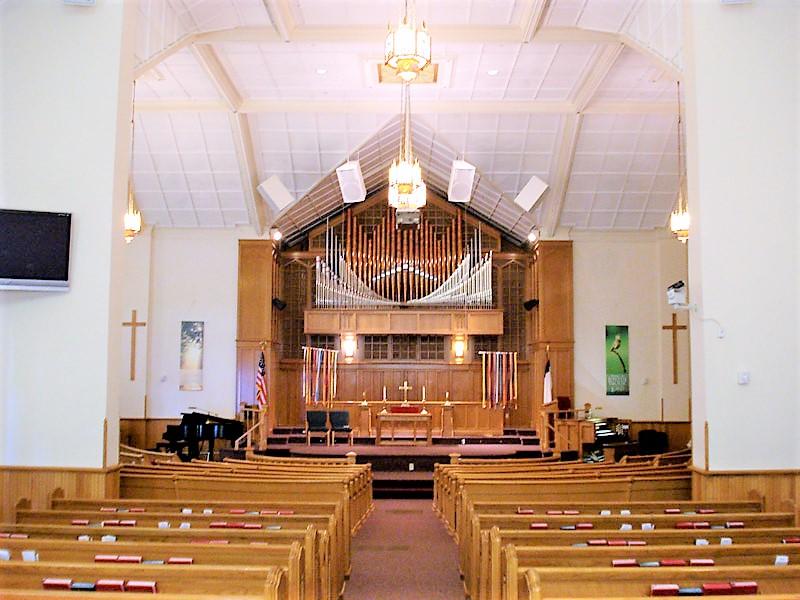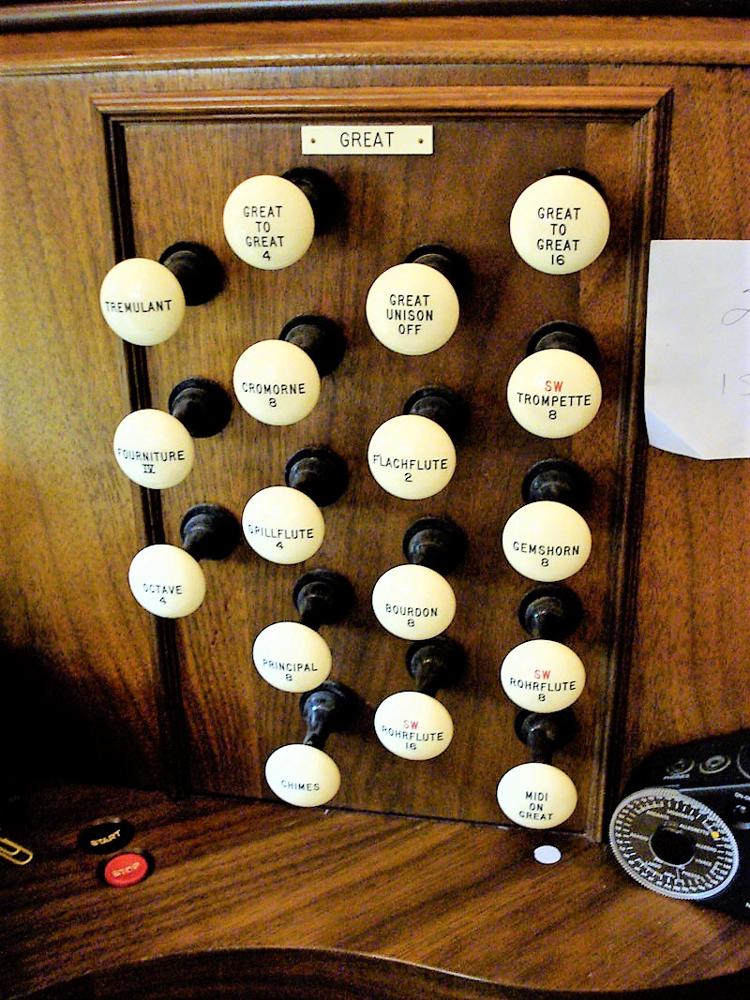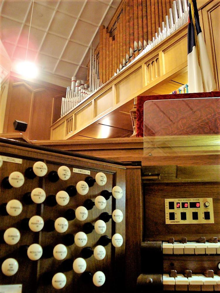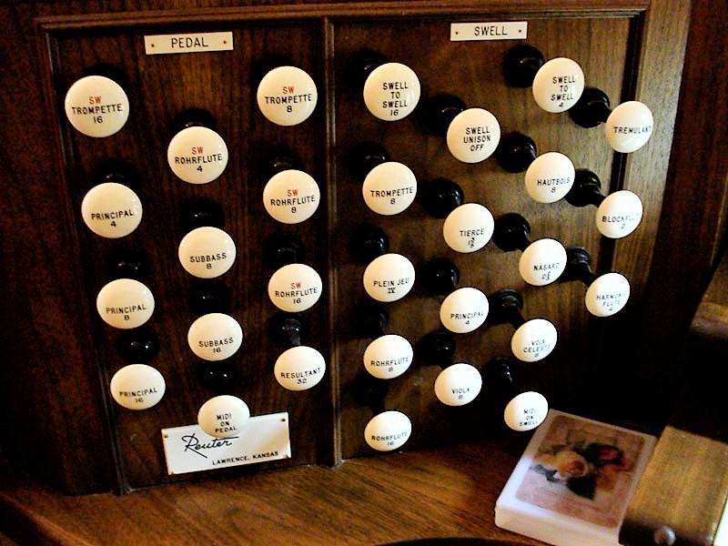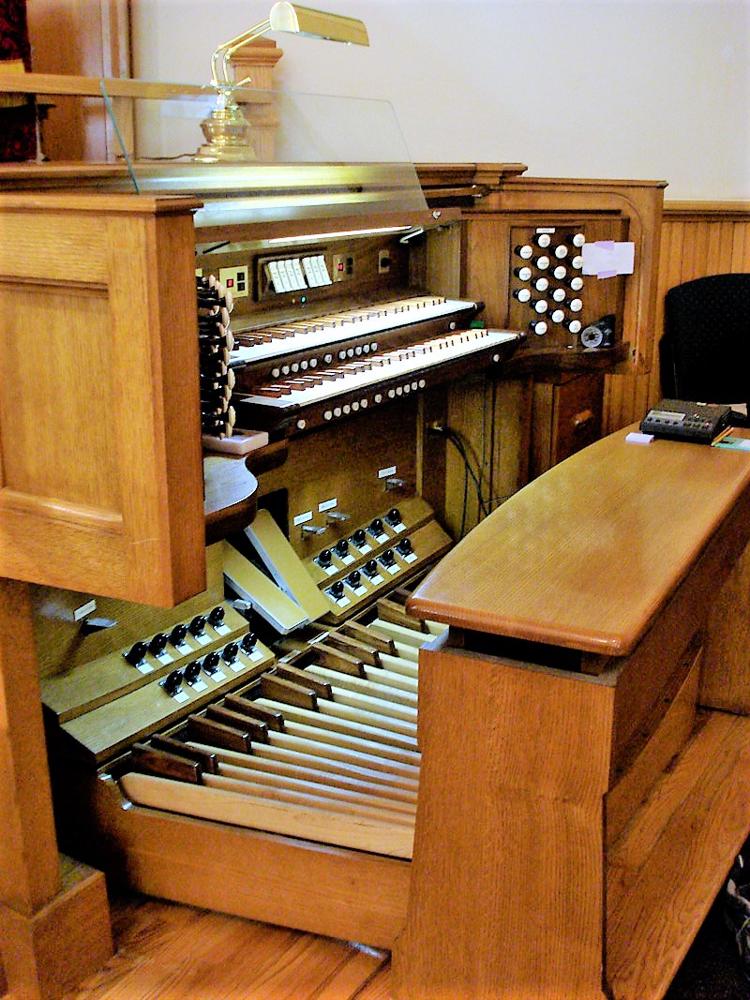Updated through on-line information from Bryan Dunnewald. -- Nice organ with good acoustic. Tracker touch console with bone naturals and cherry (?) sharps.