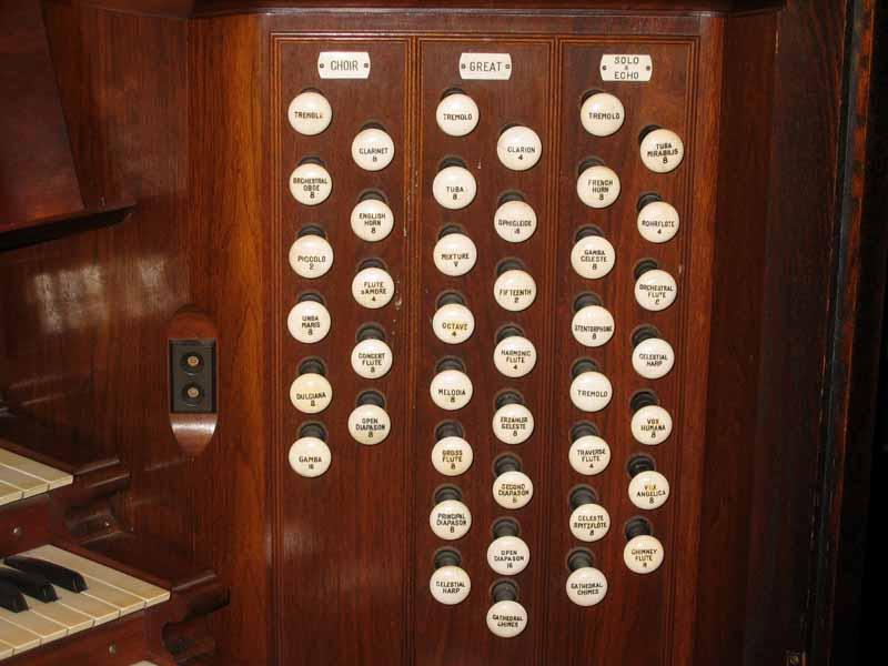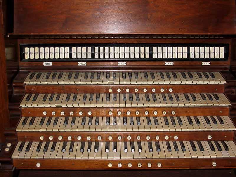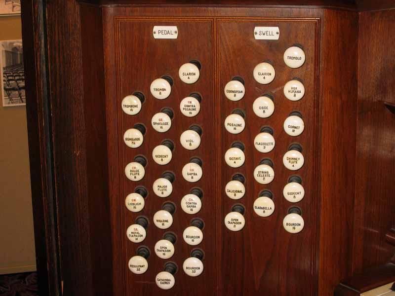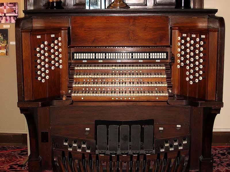 Updated through online information from JOHN R WINKLER. -- A XYLOPHONE has been added after 2000 and is not enclosed. The stop for it is on a blank stop within the swell stops. There is a single keyboard that can be connected to the stage organ.