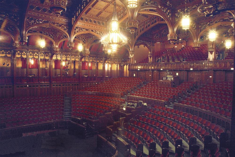 On-line update from David Kinyon -- Instrument is in reasonably good condition. The main organ, Great, Swell, Solo, Pedal, Choir are in the ceiling speaking through cloth. There is a stage division enclosed stage left. Also a small echo division in the first gallery level next to the console and and Etherial Division in the ceiling directly above the console. Console is very comfortable but definitely a Skinner button craze. [Editor's Note: This comment refers to the present Reisner console, a 1972 replacement for the original.] Unaltered since last renovation. Huge auditorium horseshoe style for Masonic work, but acoustically totally dead. Organ is quite muffled and difficult to hear from the console. Organ is rarely if every used. Suffering from dust and lack of use.