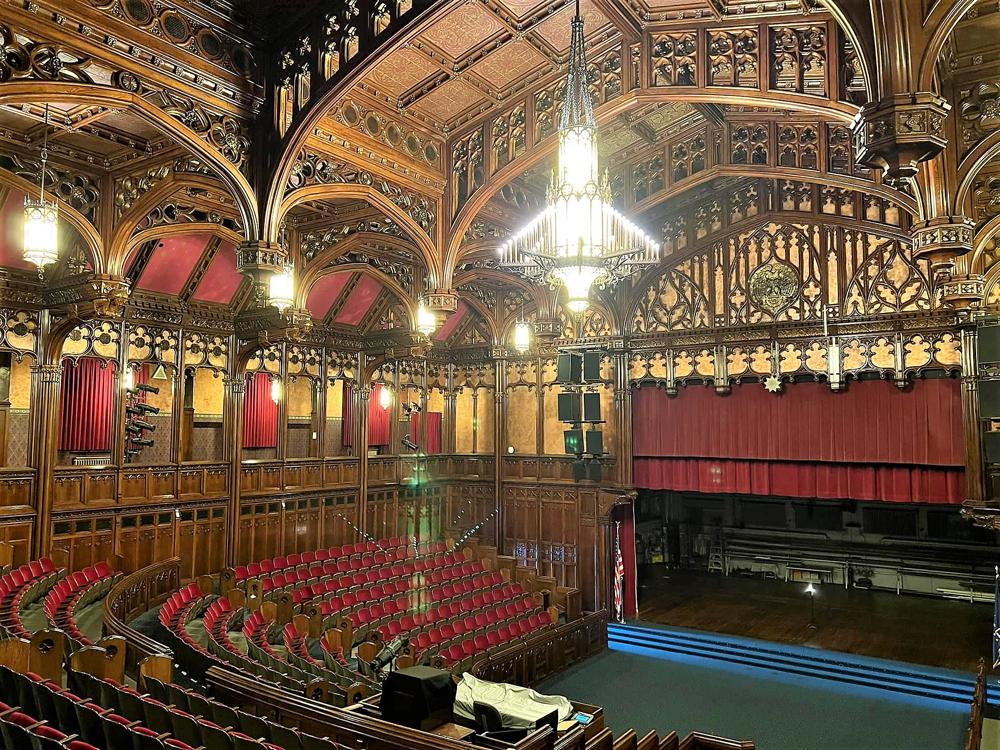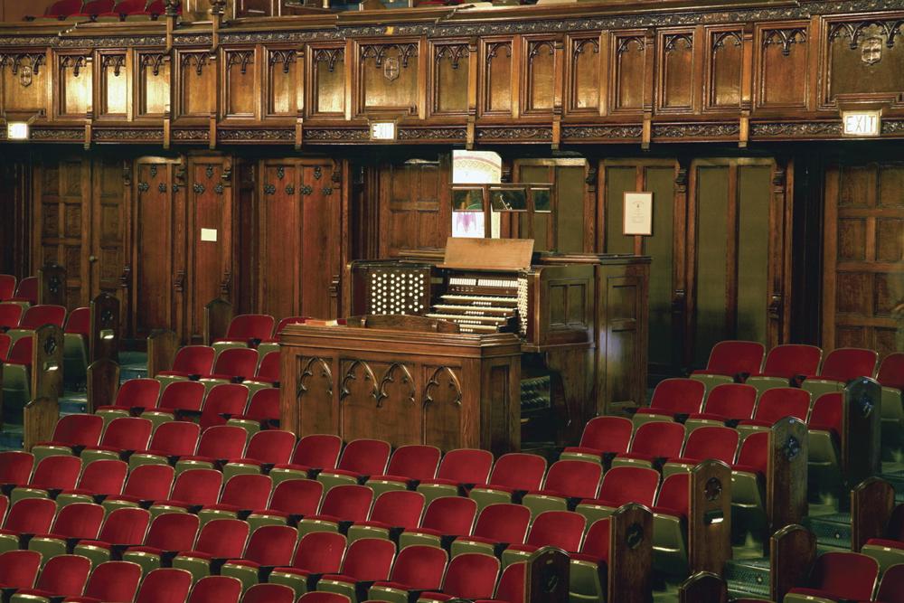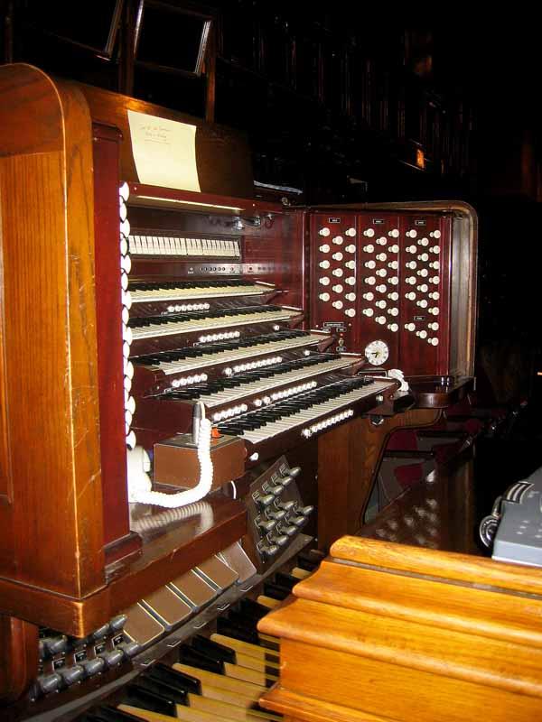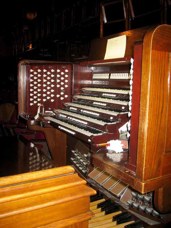 Updated through on-line information from Jeff Scofield. -- Main organ located in ceiling chamber measuring 18' by 32' above front center of auditorium; in 1969, Cave Organ Co. replaced the Skinner console with a 5-manual one by Reisner. The Skinner console is on display in the History Room.