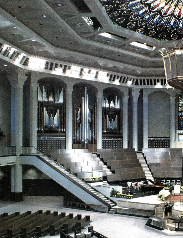 Identified through online information from James R. Stettner. -- The organ has only 6 electronic voices. Three of these are the percussions (chimes, harp 8', harp 4'). There are three prepared-for gallery divisions for future expansion. The organ also has two portable consoles that may be plugged-in to various locations around the worship center, and which control certain divisions.
