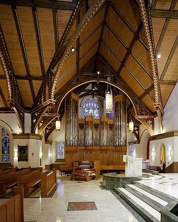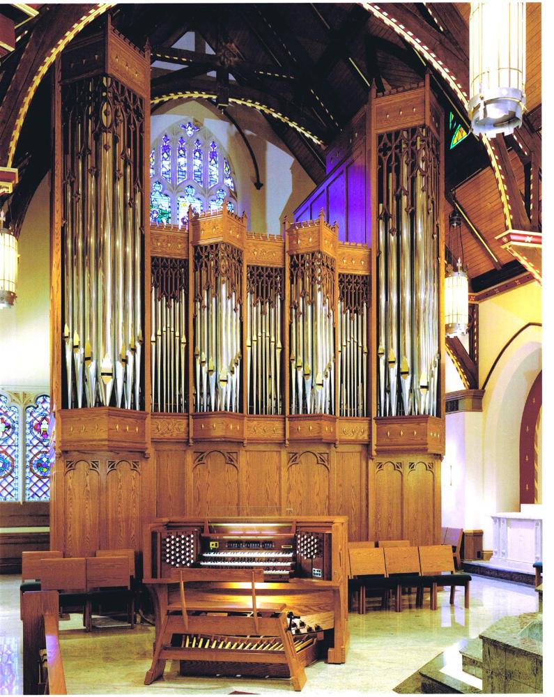 Identified through on-line information from Jeff Scofield. -- The Schantz replaced Casavant Op. 2599, a 1960 3/50 that was destroyed in a fire that badly damaged the church on June 15, 1997. The organ is located in a free-standing case in the South Transept.