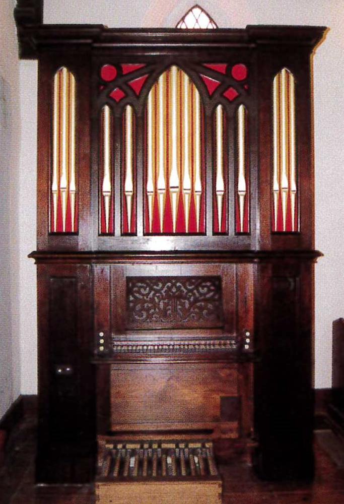 [Has also been listed as possibly Robjohn c. 1860.] From unknown. Purchased from Jardine in 1886 for $500. 20 note pedalboard and pedal coupler added by Jardine. Altered by John J. Smith c. 1930: added concave, radiating, permanently-coupled pedalboard and balanced swell pedal. Manual compass 56n. Recessed console.
