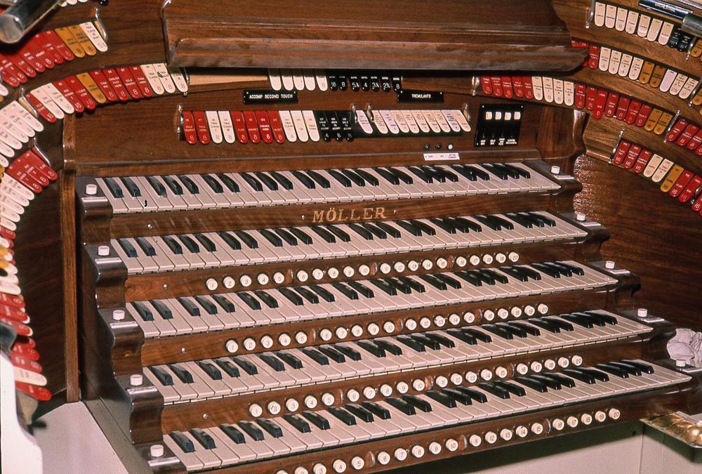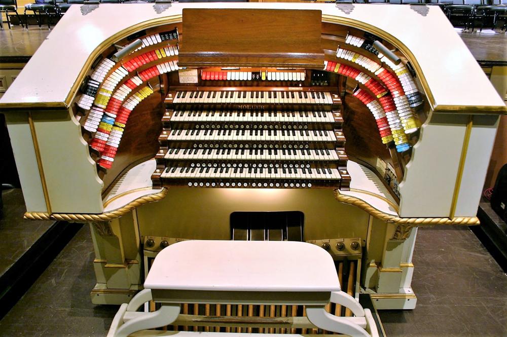 Built in 1938 as touring organ for Reginald Foort of Great Britain. Organ was sold to the BBC, which acquired the former Jubilee Chapel (an unused Methodist church) in Hoxton (north London), for a new broadcasting studio; the organ remained there for almost 30 years. In 1963, the organ was sold to Dutch Radio Hilversum, largely at the behest of organist Cor Steyn, and installed in a church ("Tesselschadekerk") in Hilversum, The Netherlands. Cor Steyn died soon after the organ went on the air; due to a lack of suitable players, the organ remained silent for most of its time in Holland. In 1973, Peter Möller Daniels of M.P. Möller, inspected the organ for a prospective buyer, Preston M. (Sandy) Fleet, who wanted it for his Organ Power Pizza #2 restaurant in Pacific Beach, California. The organ was shipped to the Möller factory where it was refurbished. Several alterations were made: the Doppel Flute was replaced with a Brass Saxophone, while the original Saxophone was replaced by a French Horn; the Post Horn was extended down to 16' pitch, and the rebuilt console was refinished in white and gold. After installation in the restaurant, the organ was dedicated by Reginald Foort in November 1975. By 1979 the organ was for sale again. When the organ became available, Gordon Belt and J.B. Nethercutt purchased the organ and donated it to the city of Pasadena for installation in the Civic Auditorium. Dave Junchen and Steve Adams installed the organ over a period of nine months, spending much time re-regulating its pipes and tremulants toward a more theatre organ sound. Tom Hazelton played the dedication concert on April 23, 1980; Reginald Foort was in attendance, and was moved to tears.