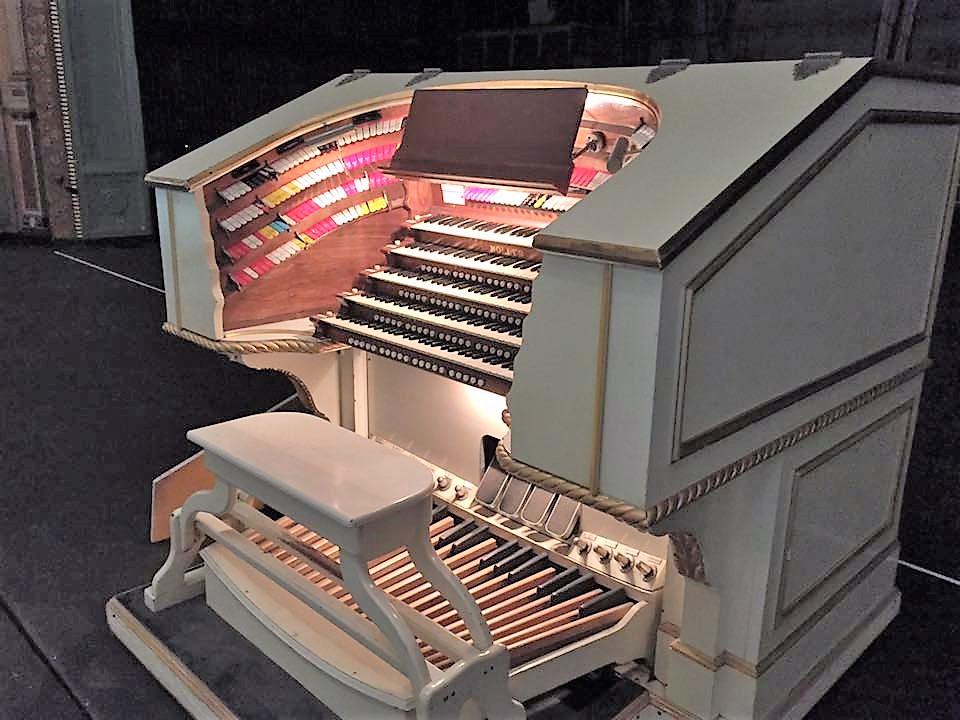 Identified through online information from Jeff Scofield. -- Built in 1938 as Englishman Reginald Foort's travelling organ. After 136 road trips around England, it was loaned to the BBC during WW II, then sold to them. In 1975, it was sold to a California pizza parlor. In 1980, it was sold to the Civic Auditorium in Pasadena, where Foort now lived. He died a few weeks after its first use.