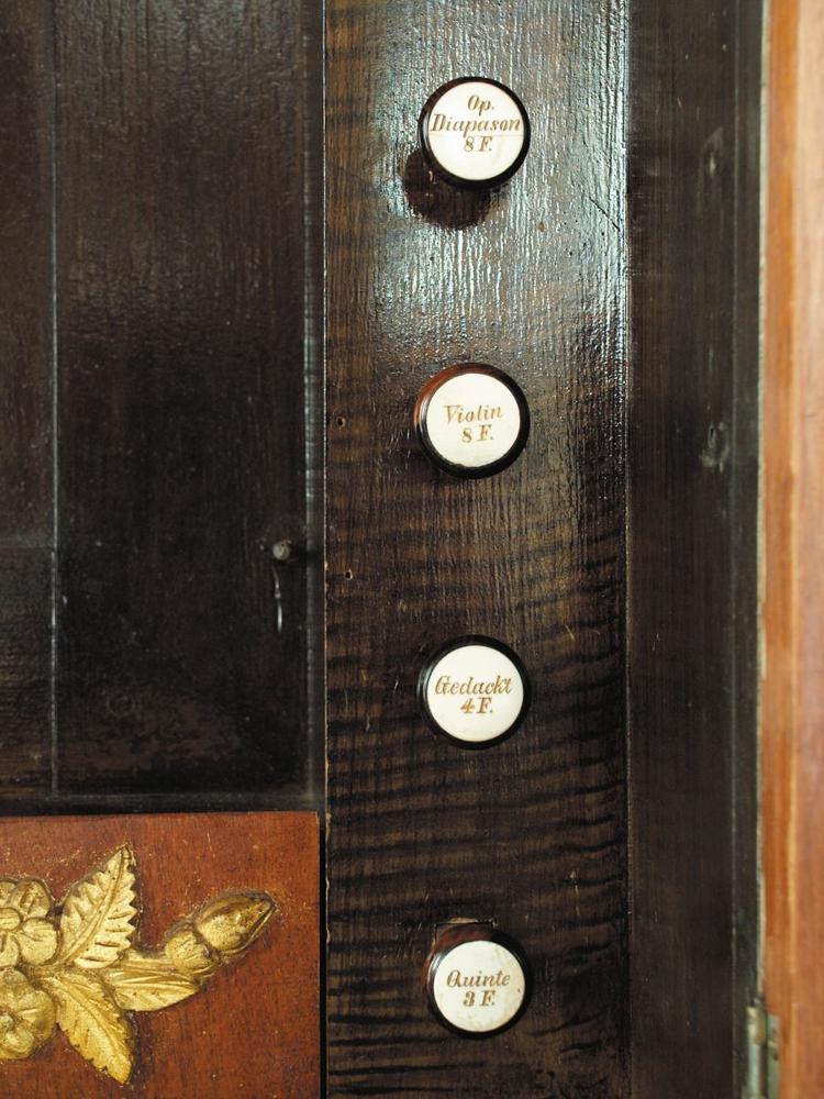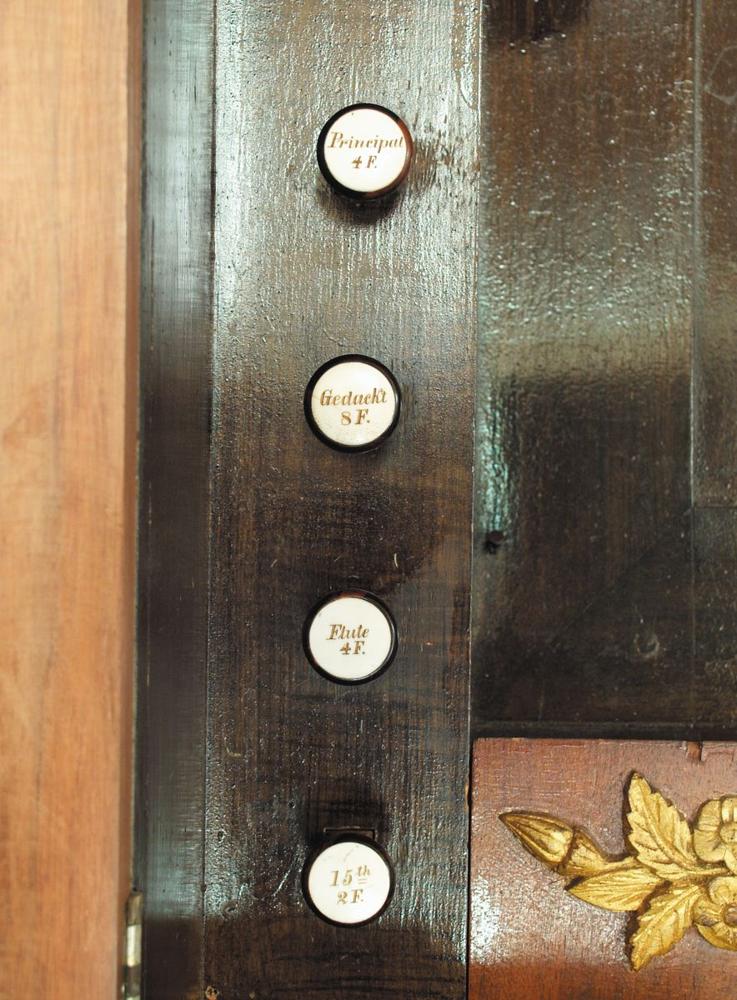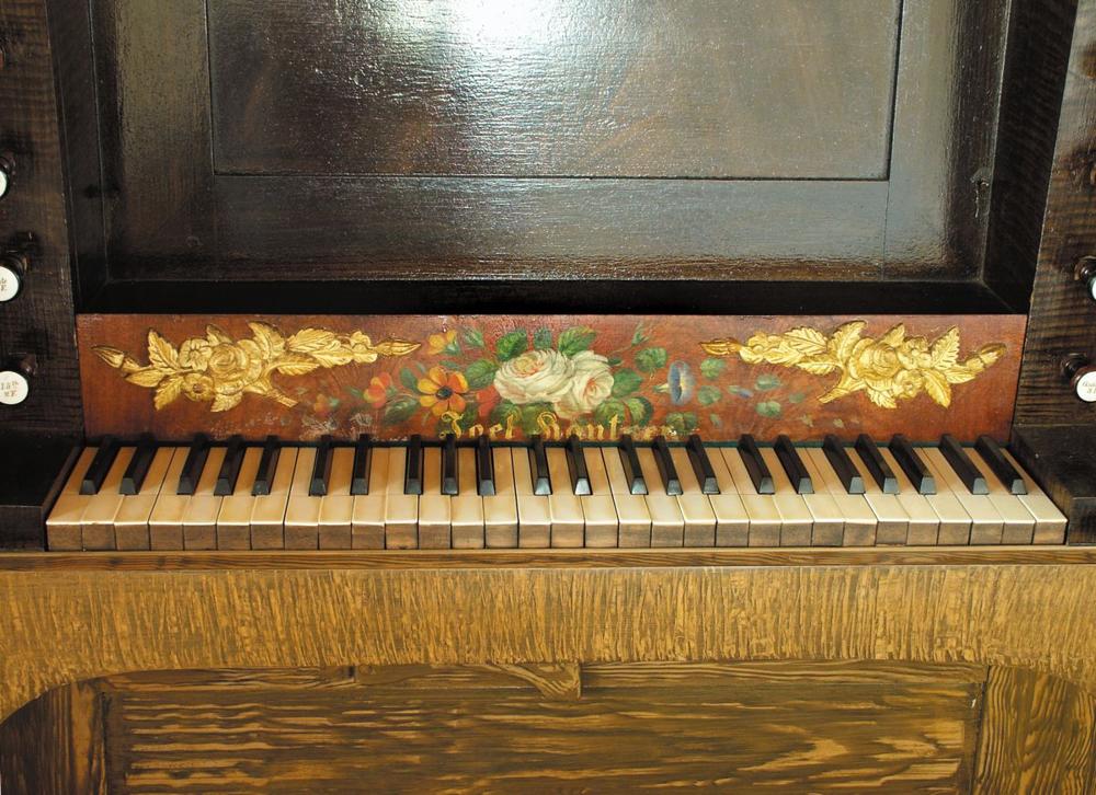 Cost $600. Bottom 12 notes of the Violin 8' are grooved from the Gedackt. The 15th is reversible from a knee lever. OHS 1976 attributes the organ to Krauss, confusing it with an Andrew Krauss organ that was built in 1837 for Christ Church, Tulpehocken (near Stouchburg). Restored 1988 by Columbia Organ Works.