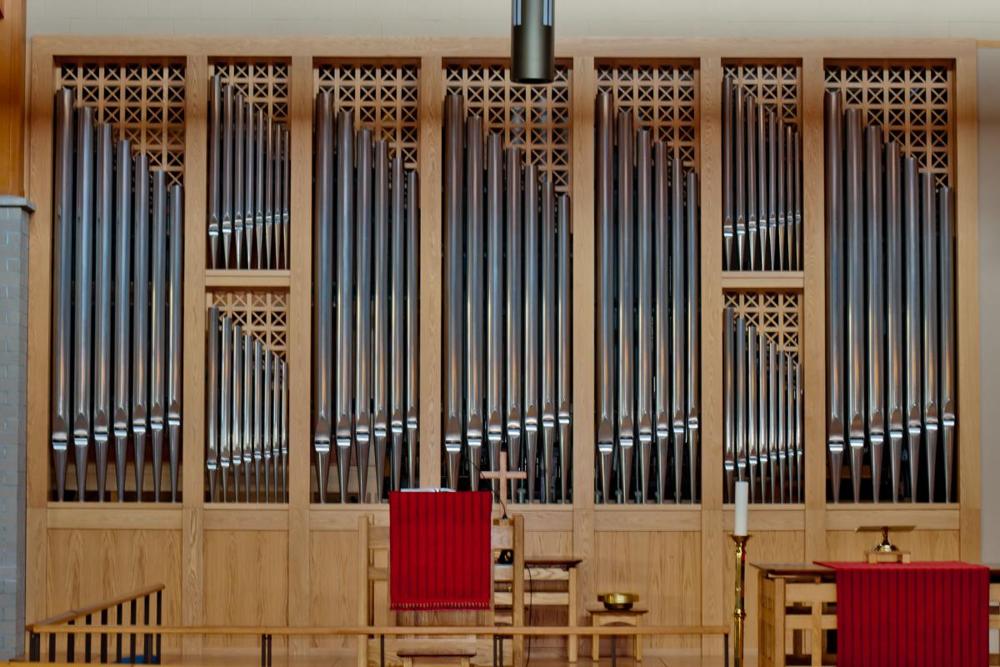 Updated through on-line information from James R. Stettner. -- This instrument utilized the Möller chancel Great, Swell, and Pedal divisions as its basis. The console is from the Antiphonal organ, and rebuilt with all new solid state components. The casework is entirely new, and consists of 7 flats with 69 pipes arranged: 7-18-6-7-6-18-7. The two flats of 18 pipes are divided into upper and lower sections of 9 pipes each.