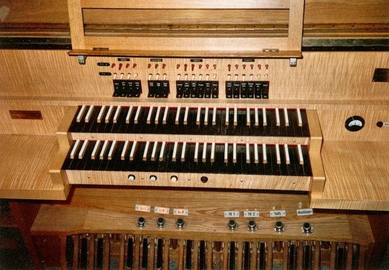 Updated through online information from James R. Stettner. -- All finger pistons and toe studs are illuminated when actuated. They do not visibily affect stops at the console. Use of the pistons and studs overrides manual activation of the stops. The organ was installed for Kleuker by Olympic Organ Builders of Seattle. The organ was rebuilt and enlarged by Rodgers. It is not yet known if the mechanical action was retained.