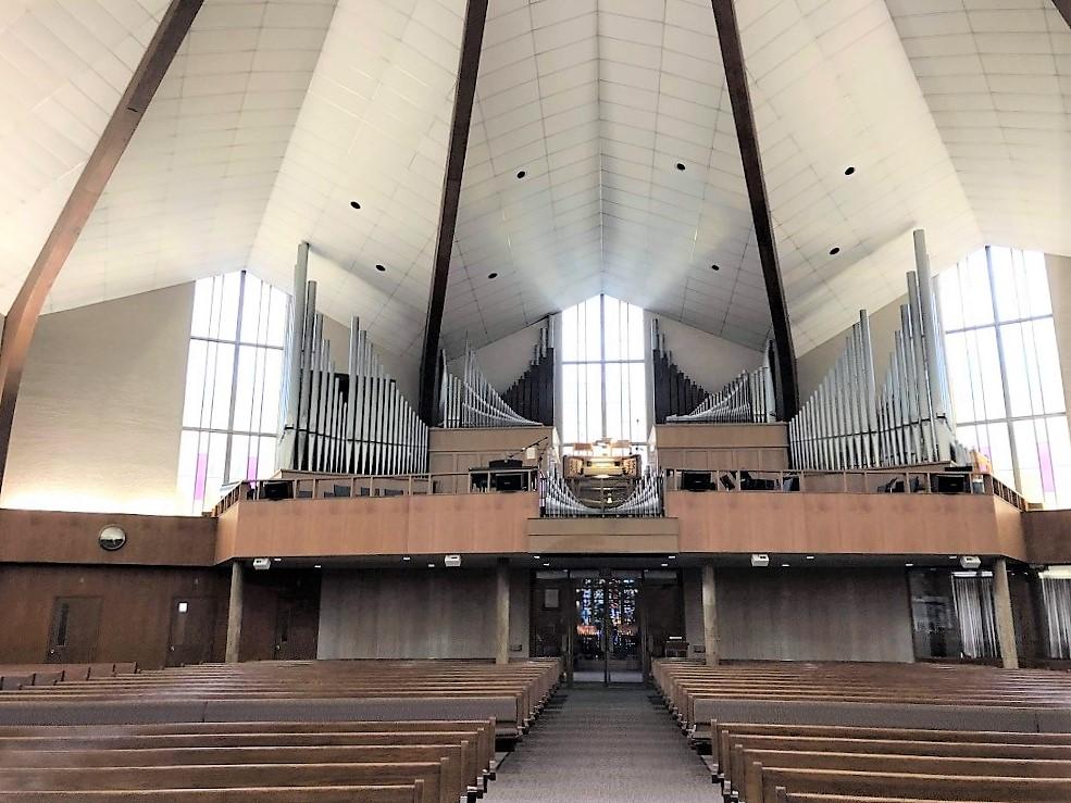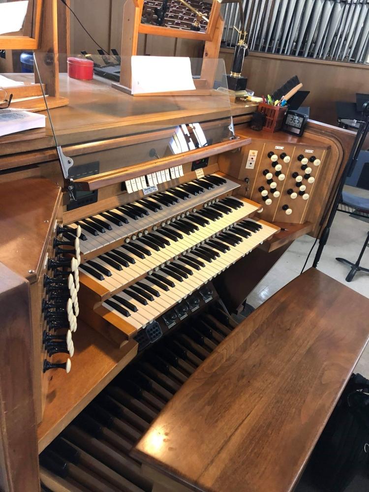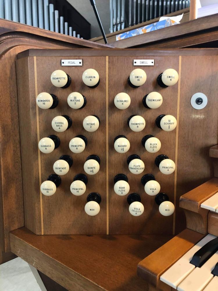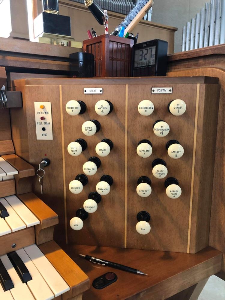 Updated through on-line information from James R. Stettner. -- From photos taken in March 2020, it appears that the organ has had a solid state upgrade as there is a MIDI drawknob available in each division now, and an LED control panel is visible to the left of the coupler rail. However no tonal changes or additions are evident.
