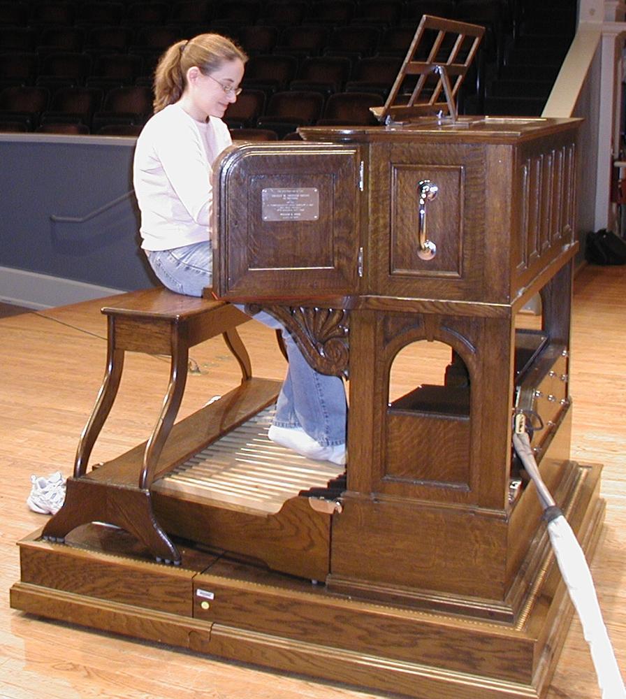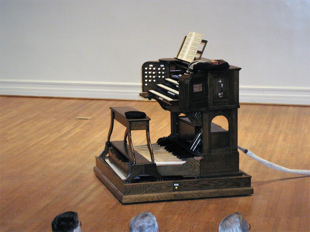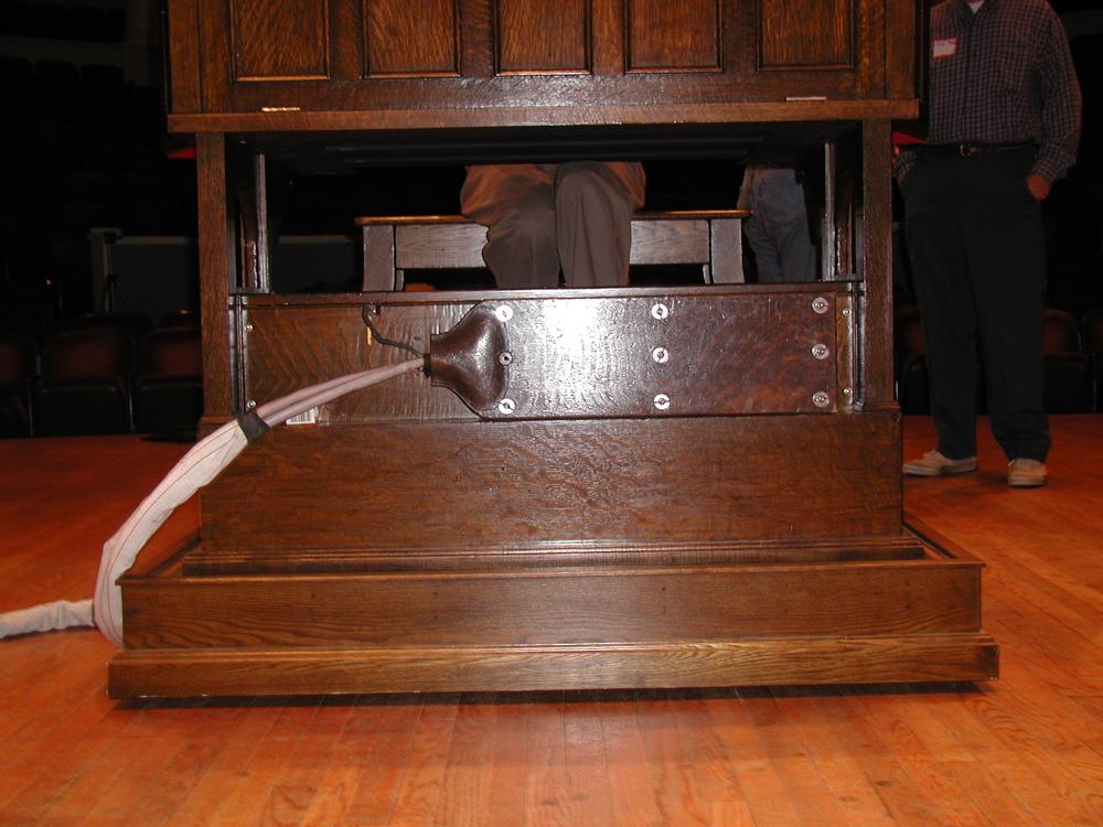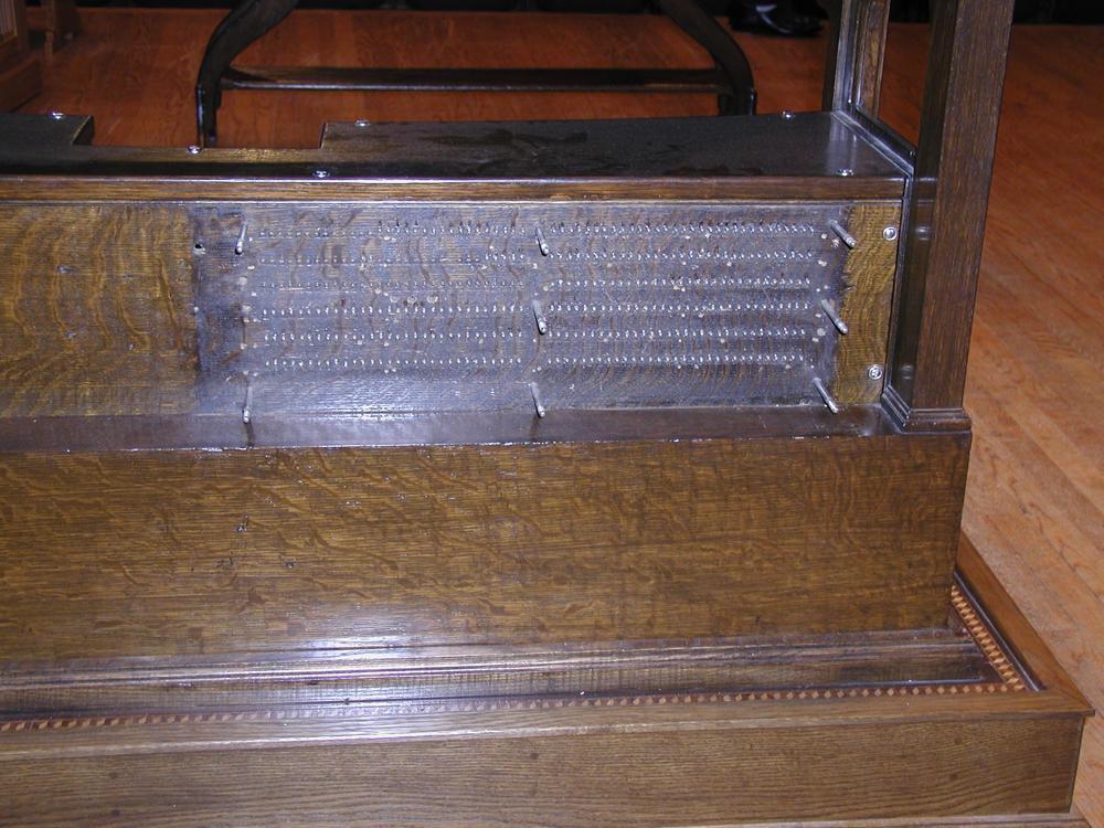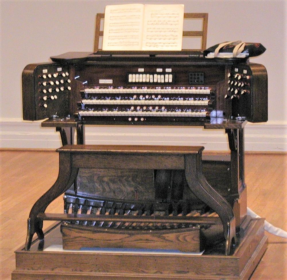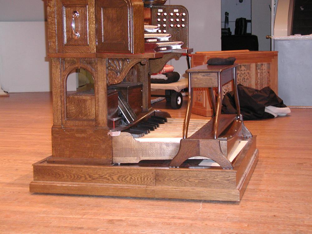 Updated through online information from Bob Moody. -- Hutchings-style batwing console. 30 note pedal. Great 16 open has monkey quint on bottom 6 notes. Remote stepper combination machine. Have to climb through swell chest or use a ladder to make changes. Magnets have separate windings for each use. E.g. Swell to Great has separate winding for 16, 8, and 4. Duplexing handled the same way.