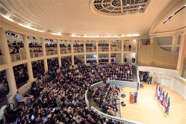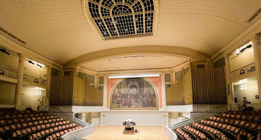 Updated through online information from Stephen Hall. -- Console is stored in a small room off the stage, it is mounted on a movable platform. Organ is in regular use (2008) primarily ceremonial occasions such as baccalaureate ceremonies, but it is included in performances of several musical organizations and serves as a practice instrument for student organists. (per Press Release by the University dated April 22, 2008)
