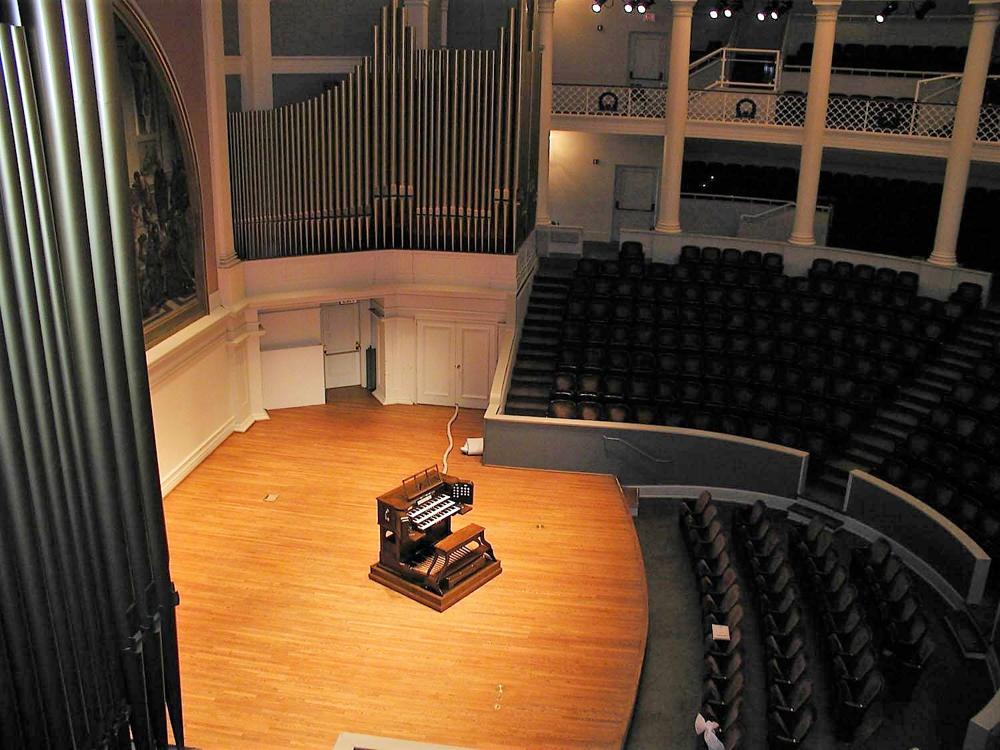 Movable console. Original fold-up console restored c. 1983 by A. Thompson-Allen Co. (Ded. 20 Oct 1983 by Earl Miller) Organ removed 1990's while hall was refurbished. Organ reinstalled by May 1996, but console not yet connected.