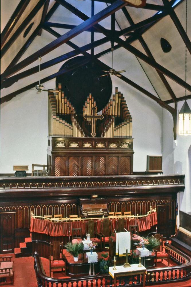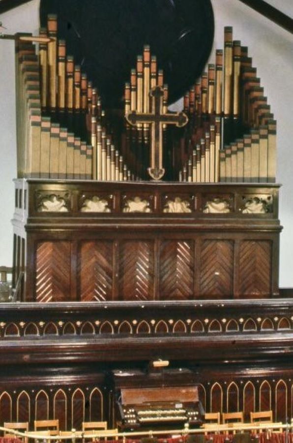 Updated through online information from David M Storey. -- The building is condemned but stable. It is for sale. The organ is non functioning. Great pipes are functionally displayed and highly stenciled. Many pipes on Great are damaged. No working blower. All pipes appear to be accounted for.