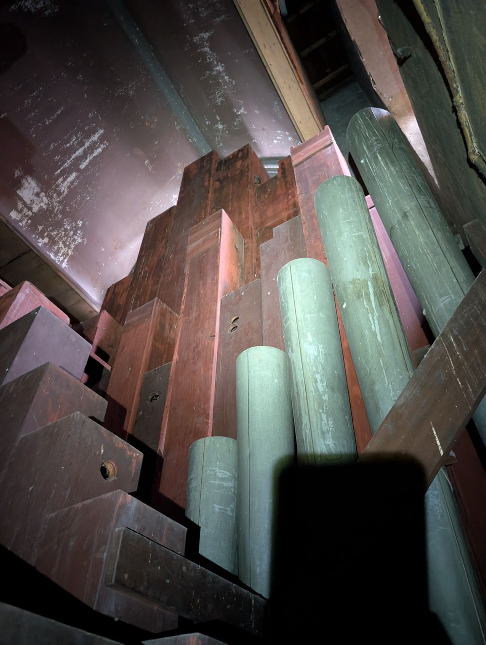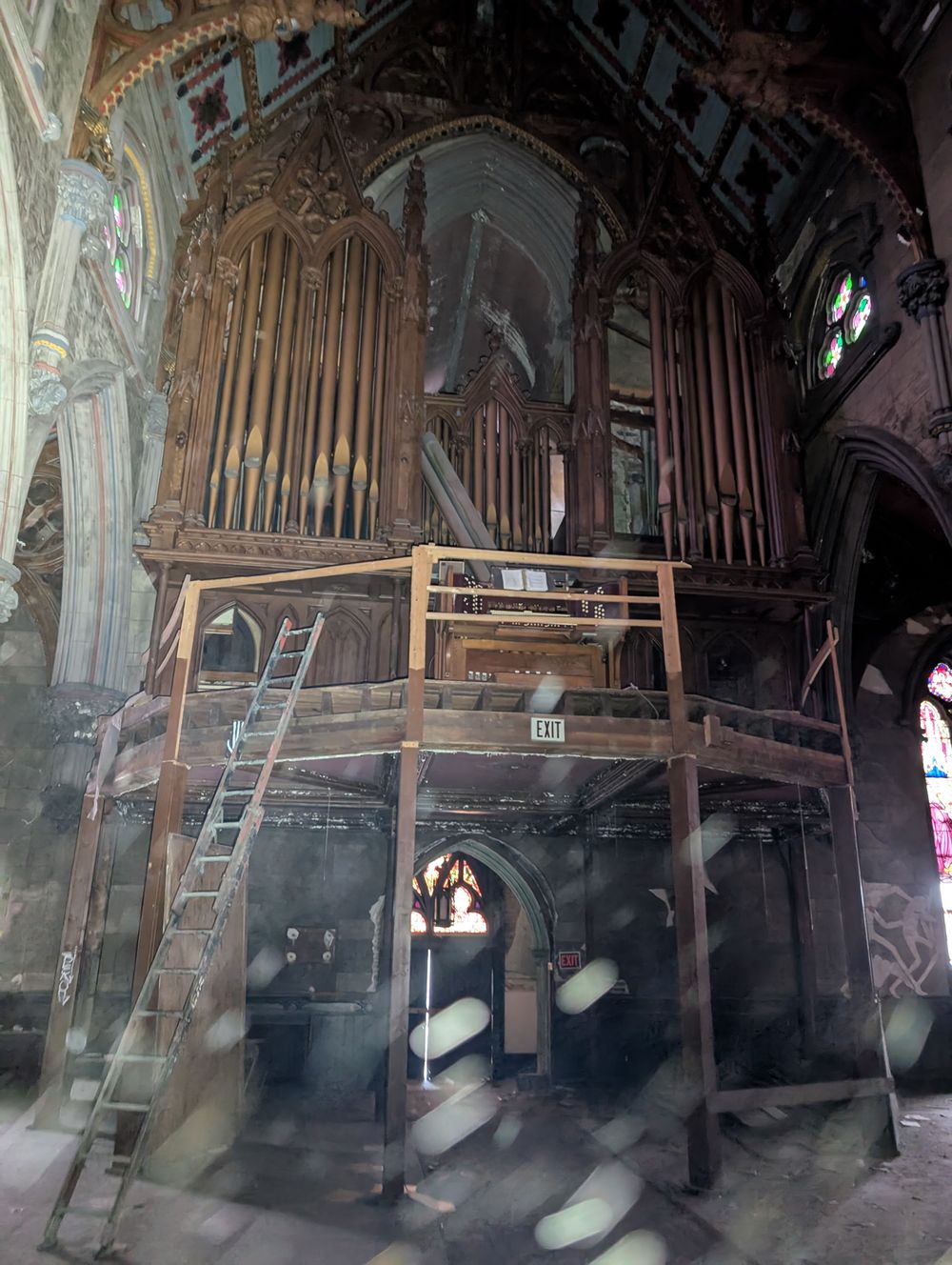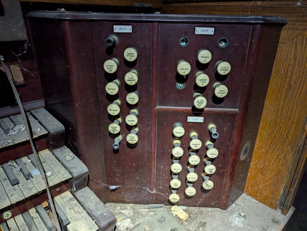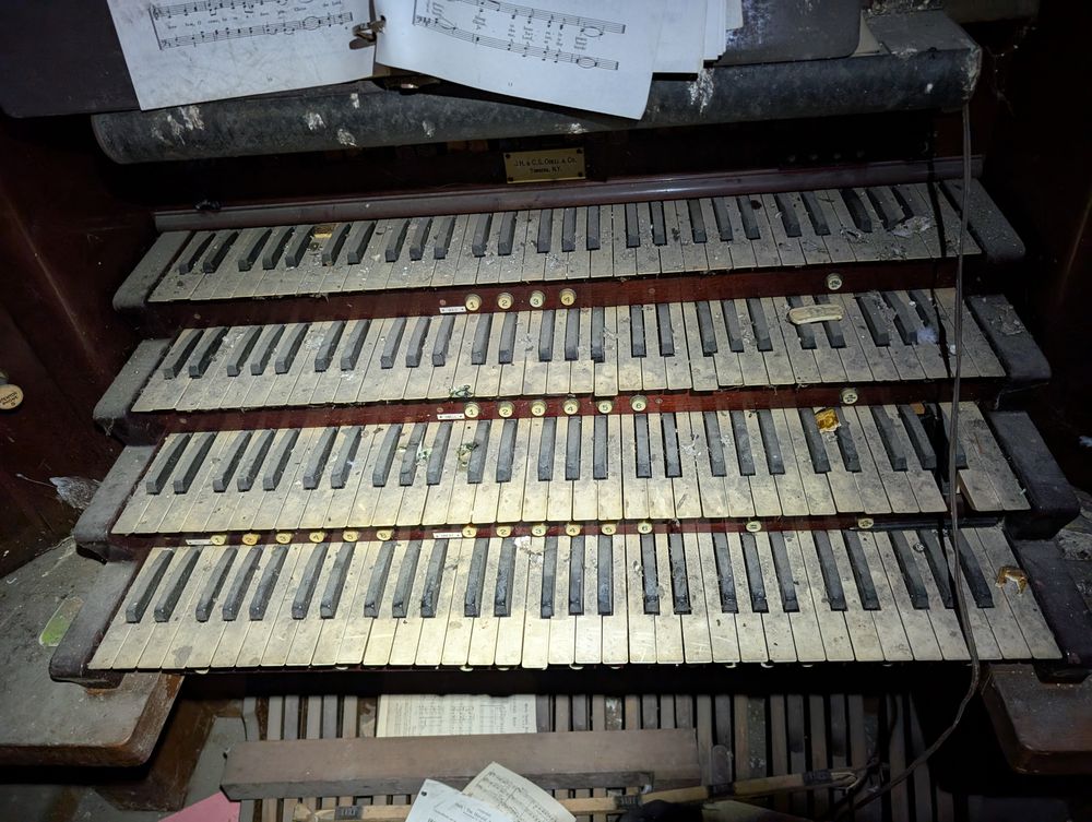 Inspected the instrument on 04/15/2025. Our firm was graciously allowed access by NAI Platform who is the realtor for the property. This instrument has suffered from vandalism in the great and solo divisions. However, the swell, choir, echo, and most of the pedal are completely intact and salvageable. The large Kinetic blower is located in the tower. The blower is powered by a large GE motor with unknown specifications as the motor nameplate had corroded due to bird droppings and exposure to the elements. The interior of the building is rather well sealed as of the early 2000s and the organ does not show signs of any major water damage. The echo division is extant and was visible through the chamber opening. We were unable to enter this chamber due to work that was done to secure the building from vandals (stairwell blocked at landing to chamber).