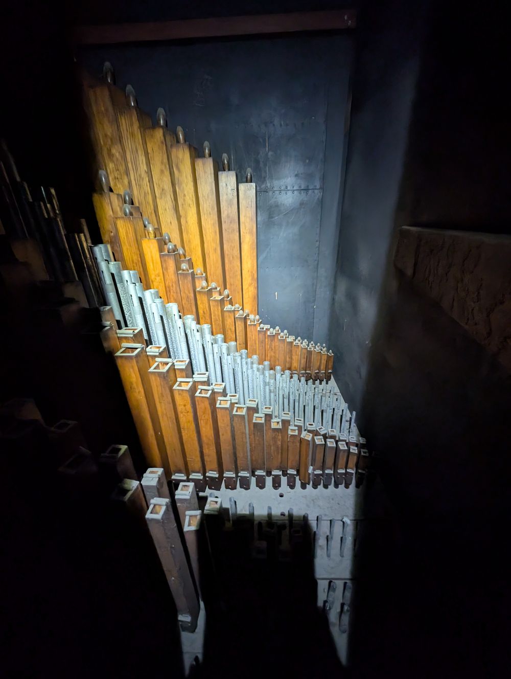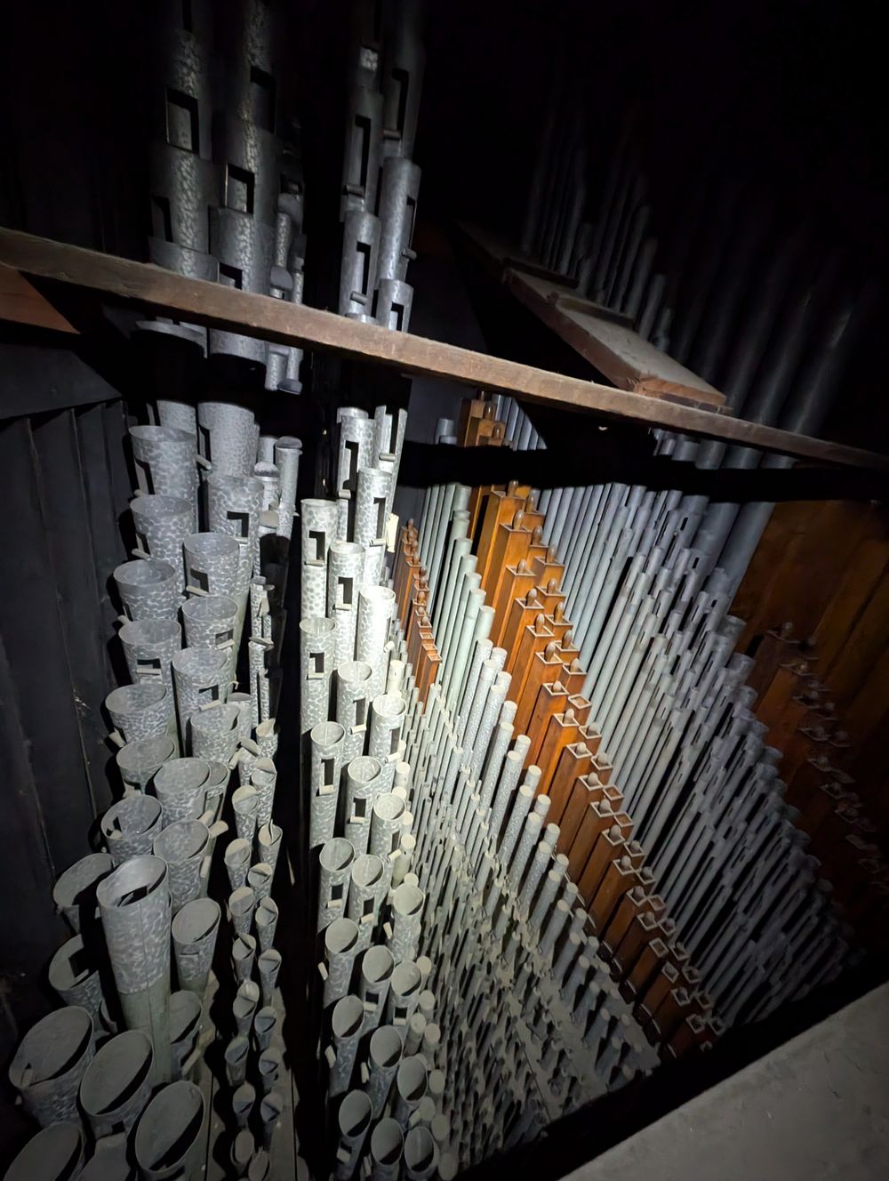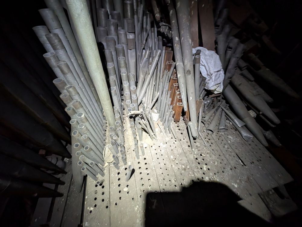 Inspected the instrument on 04/15/2025. Our firm was graciously allowed access by NAI Platform who is the realtor for the property. This instrument has suffered from vandalism in the great and solo divisions. However, the swell, choir, echo, and most of the pedal are completely intact and salvageable. The large Kinetic blower is located in the tower. The blower is powered by a large GE motor with unknown specifications as the motor nameplate had corroded due to bird droppings and exposure to the elements. The interior of the building is rather well sealed as of the early 2000s and the organ does not show signs of any major water damage. The echo division is extant and was visible through the chamber opening. We were unable to enter this chamber due to work that was done to secure the building from vandals (stairwell blocked at landing to chamber).