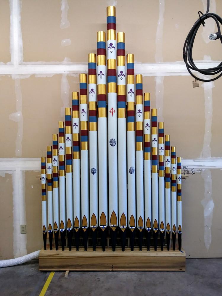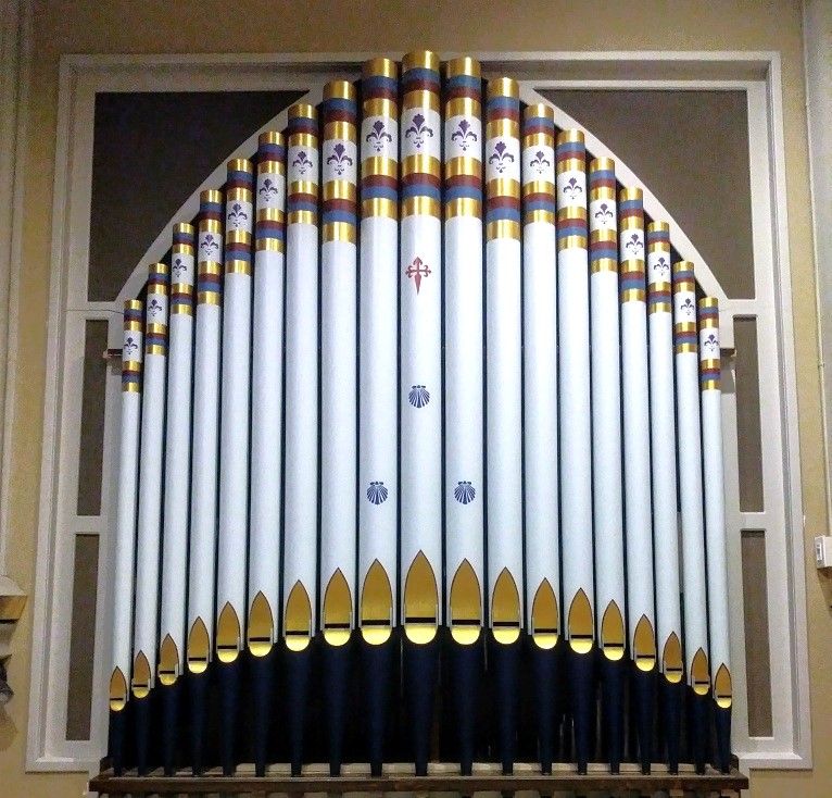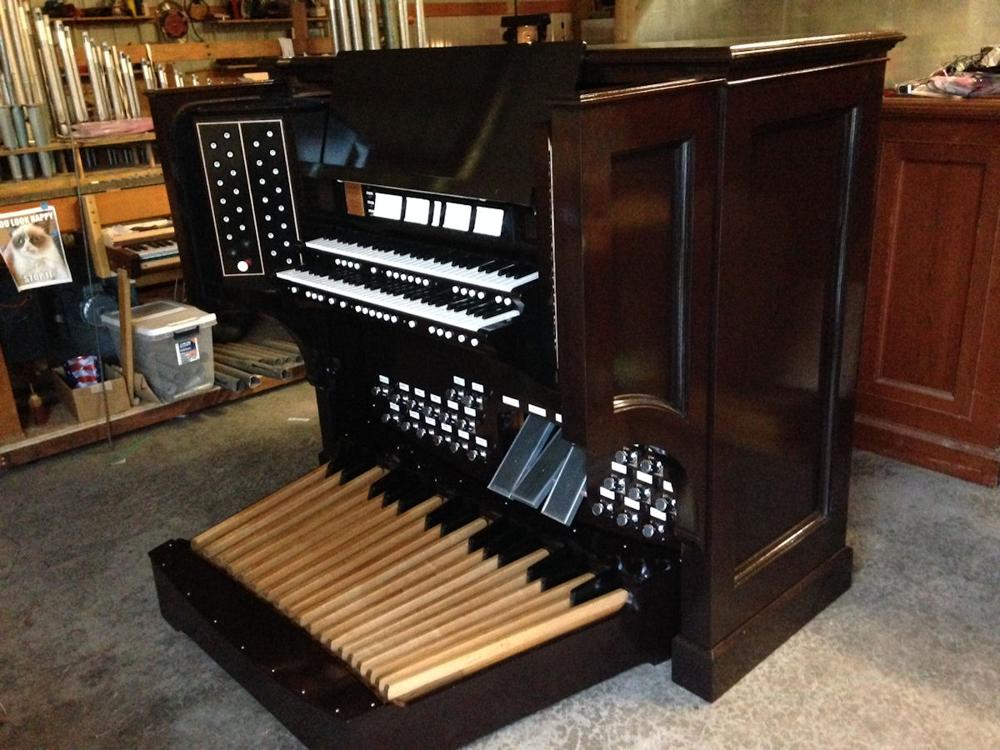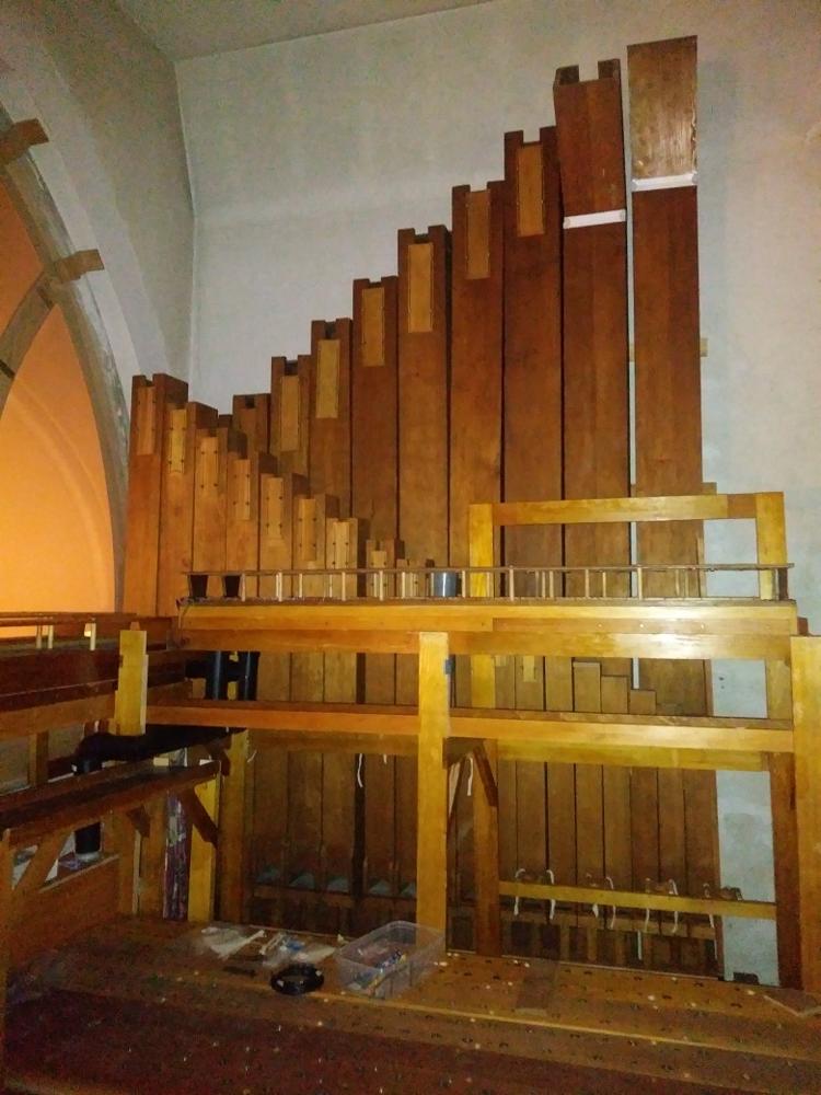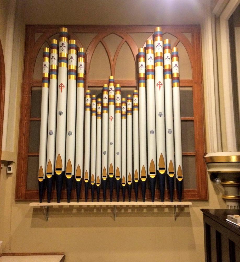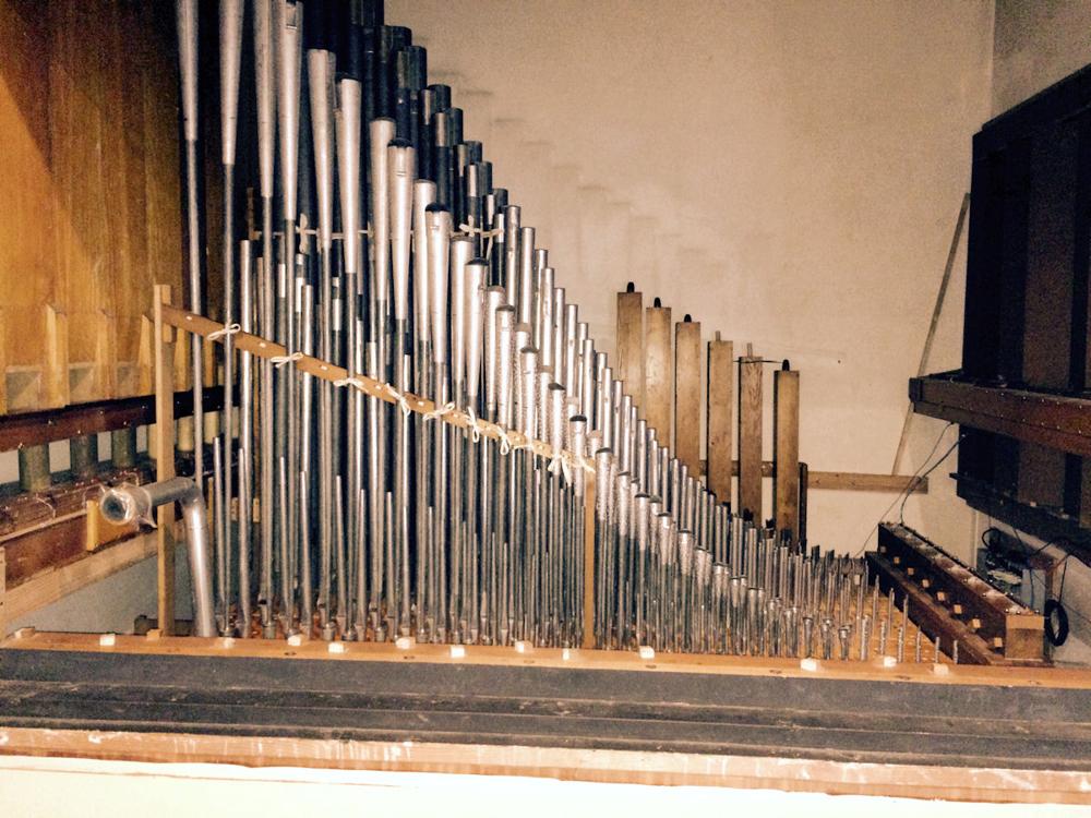 Updated through online information from James R. Stettner. -- Just before Christmas 2013, the permanent Swell 4' Principal was installed. This was a 1907 Estey (Op. 414) Swell 8' Salicional which was cut-down, de-bearded, and revoiced. Also, the Swell 4' Harmonic Flute from that same Estey was installed in the Swell. A new 19-note chest for conveyed wind to the facade pipes was also installed - replacing a combination direct-electric/electro-pneumatic chest from the 1950's electrification which had partially failed.
