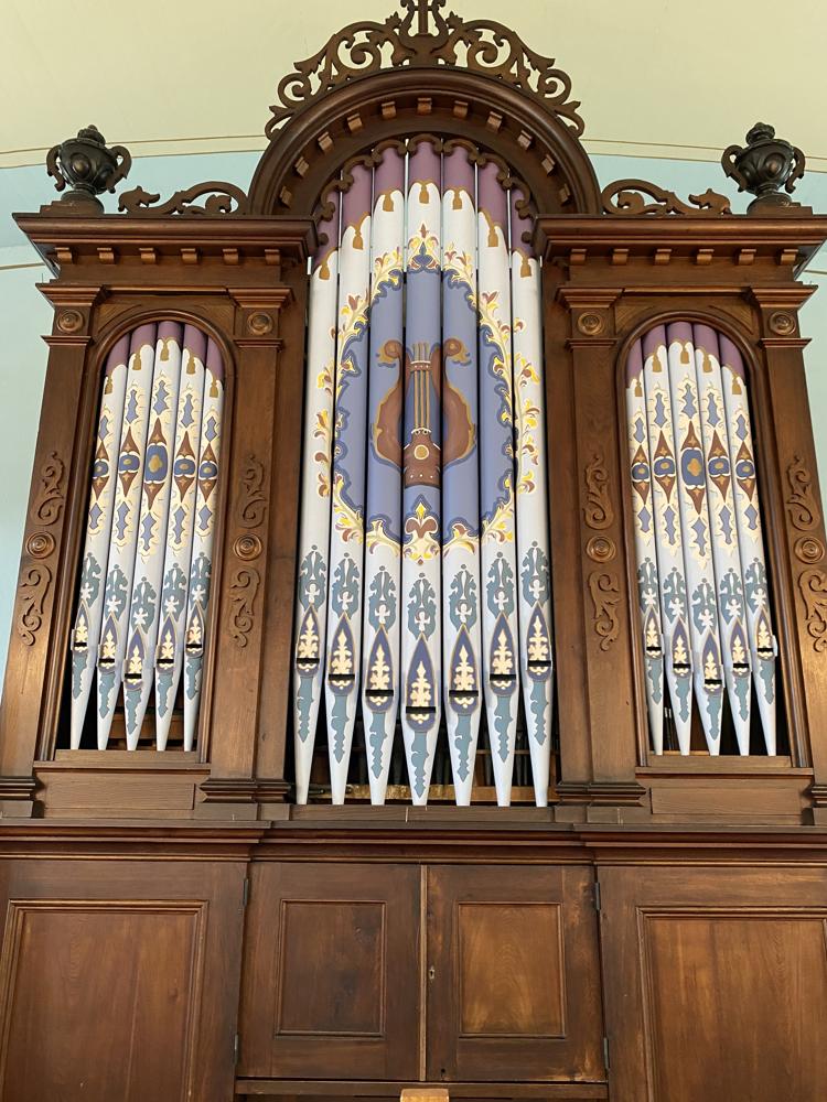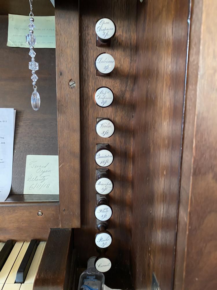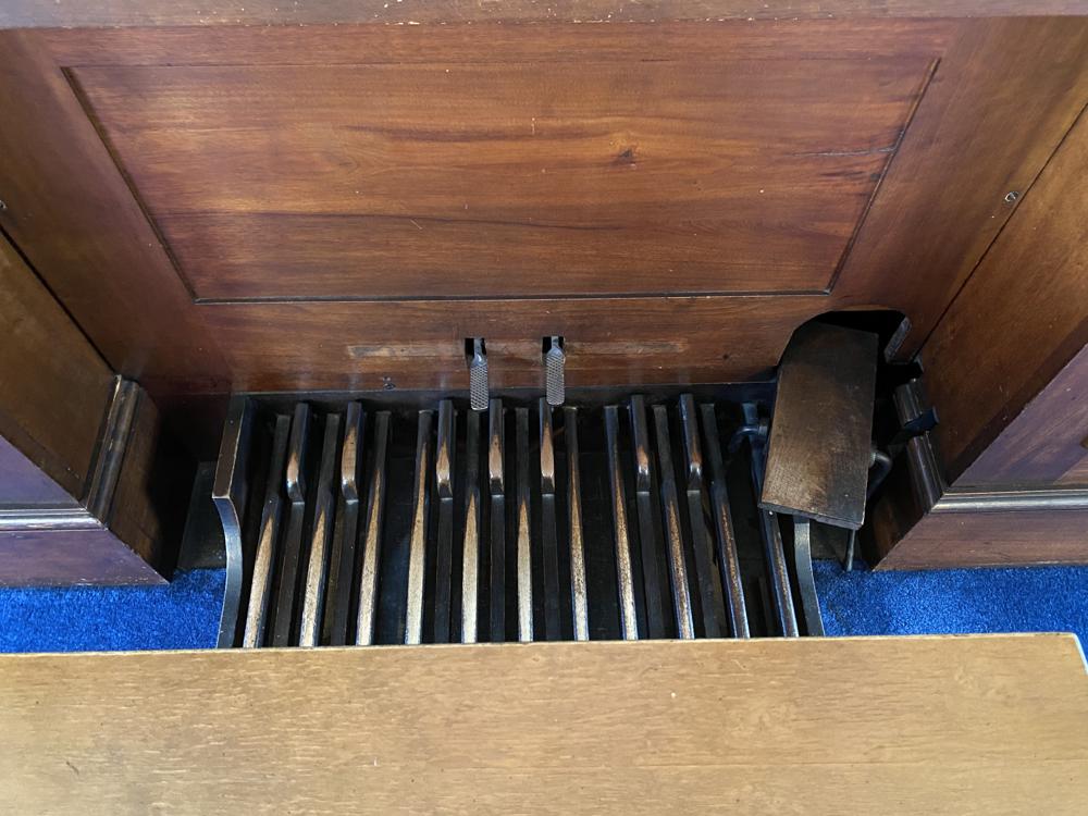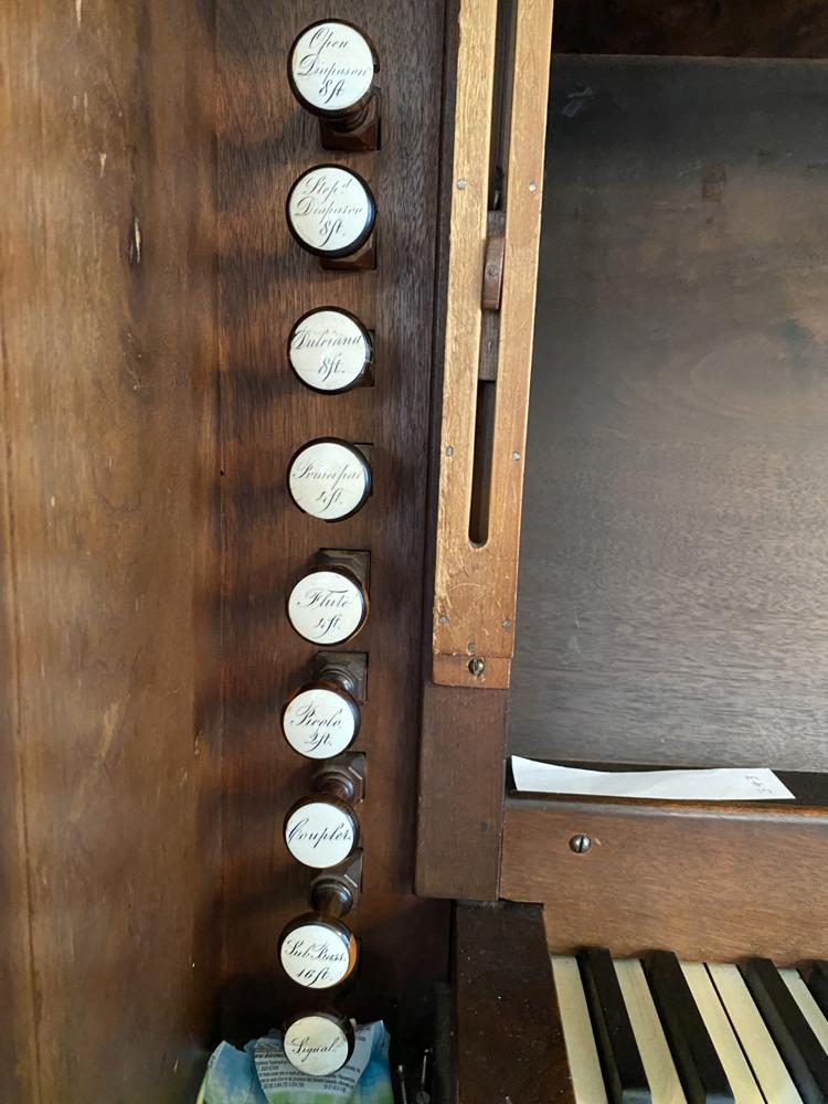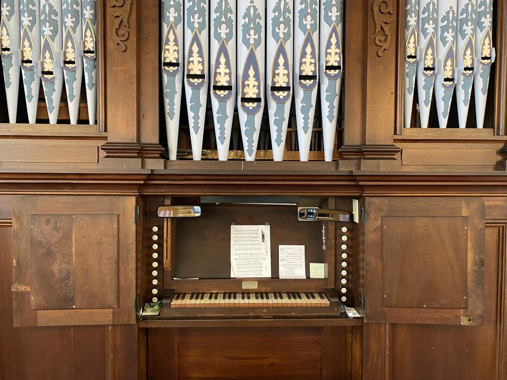 Updated through on-line information from Paul Jones. -- Status Update: Present, as of December 2008. Unknown when last restoration was done, but the organ is in a floor level case, with facade pipes exposed. The 1 manual keyboard is built into the organ case.