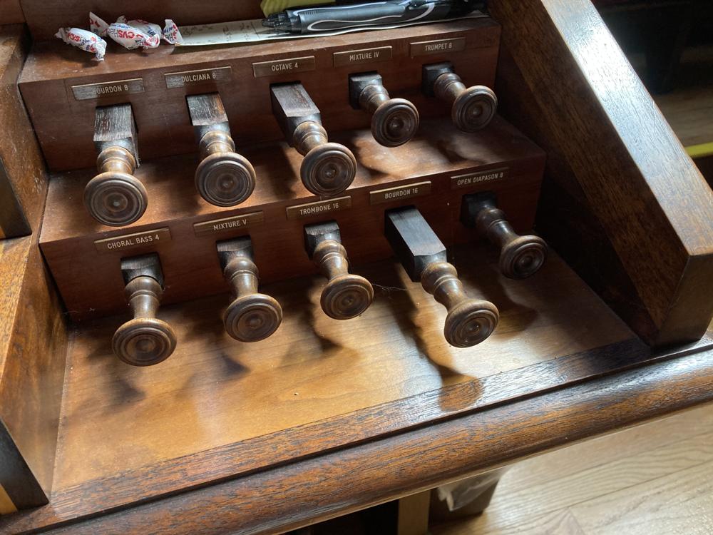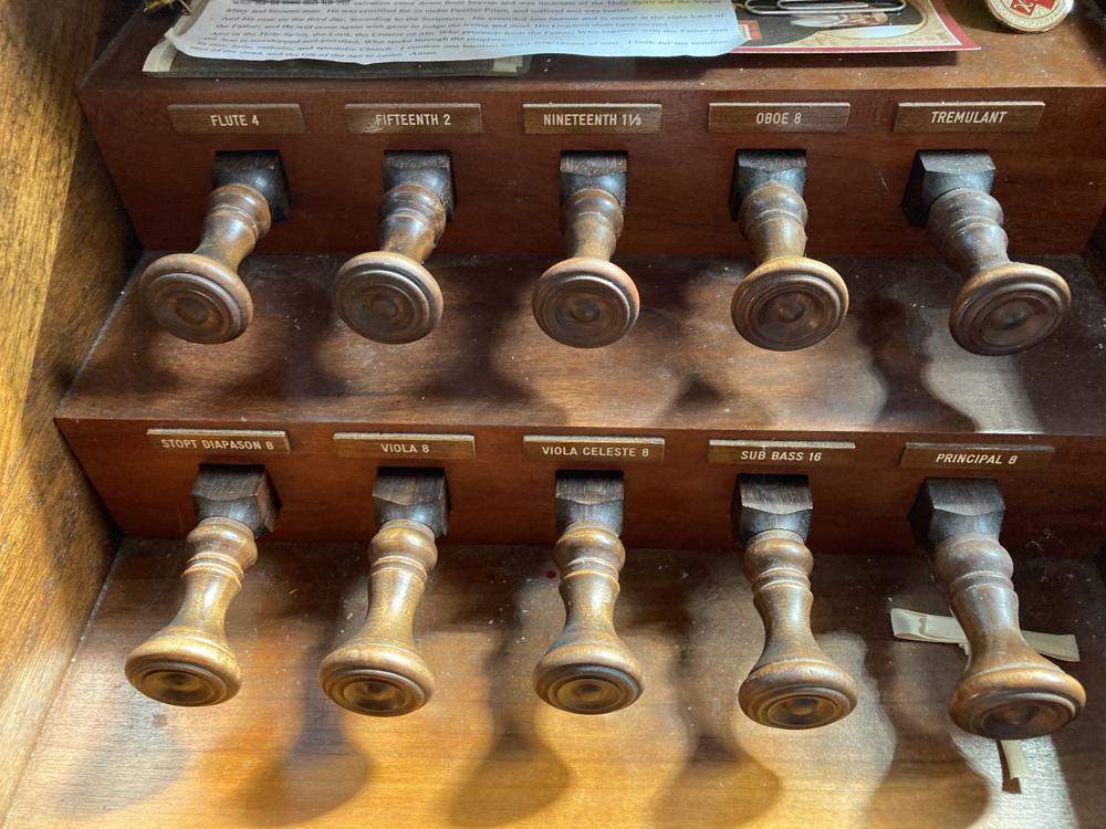 From Presbyterian, Thompsonville, CT; via Presbyterian, Enfield, CT, electrified 1960s. OCH pipes from Steere #358,1893, 2-21.