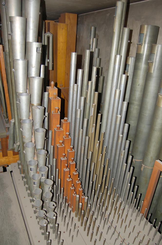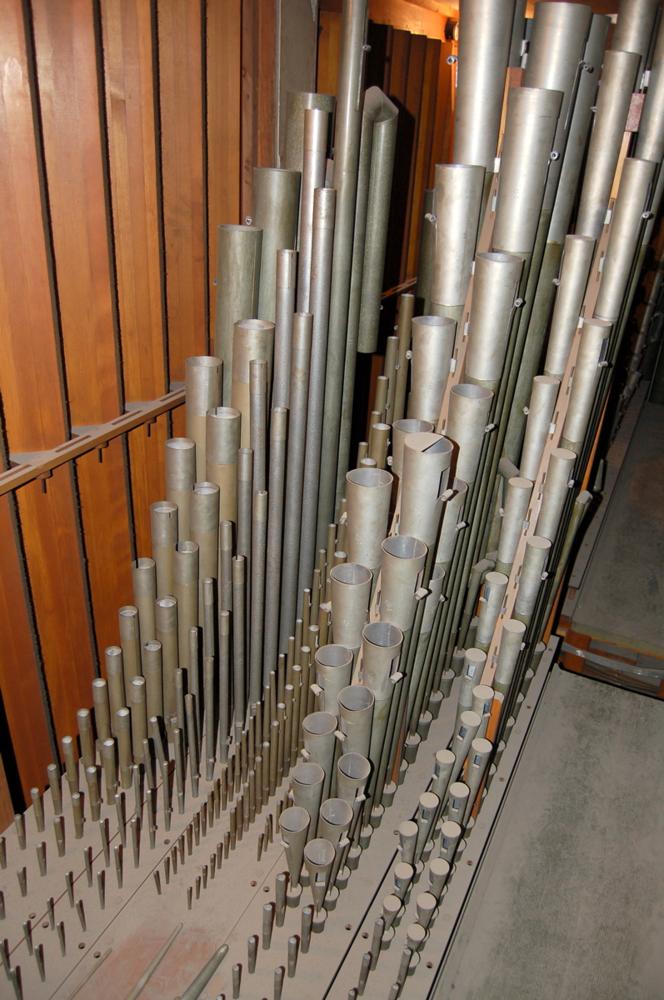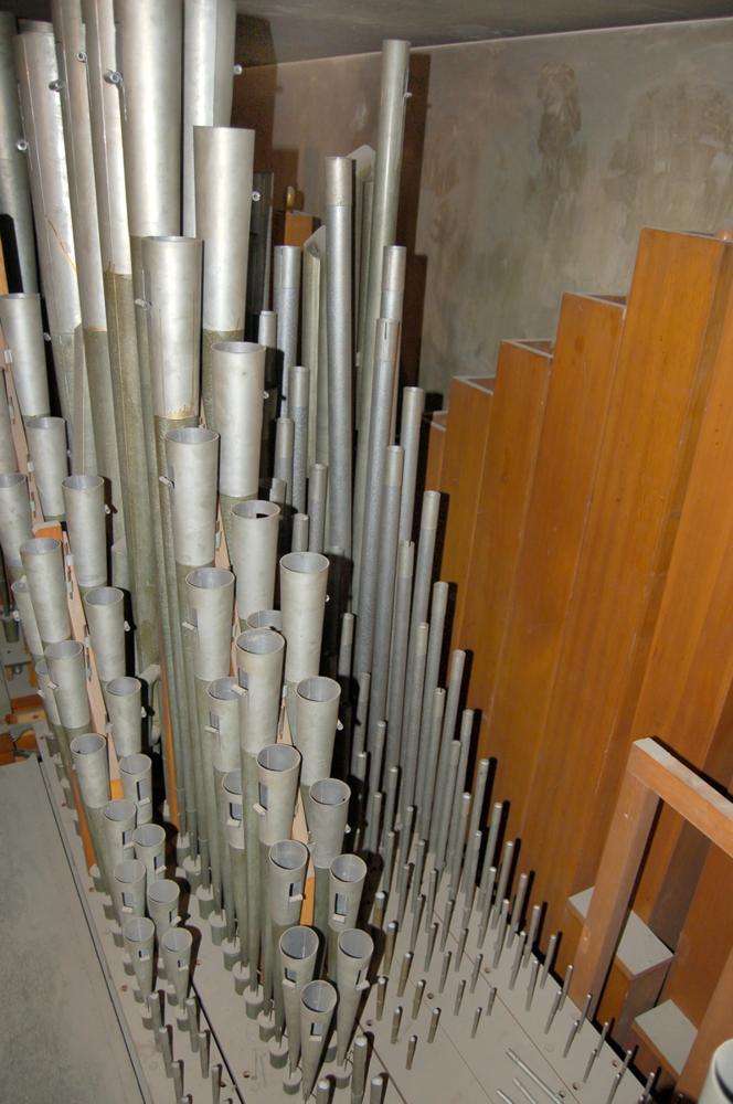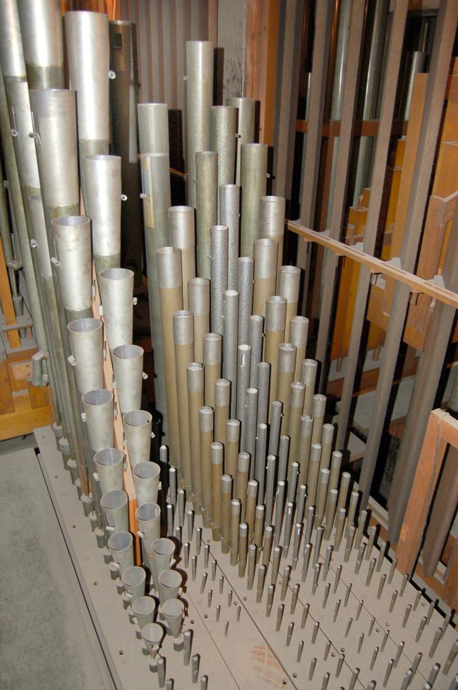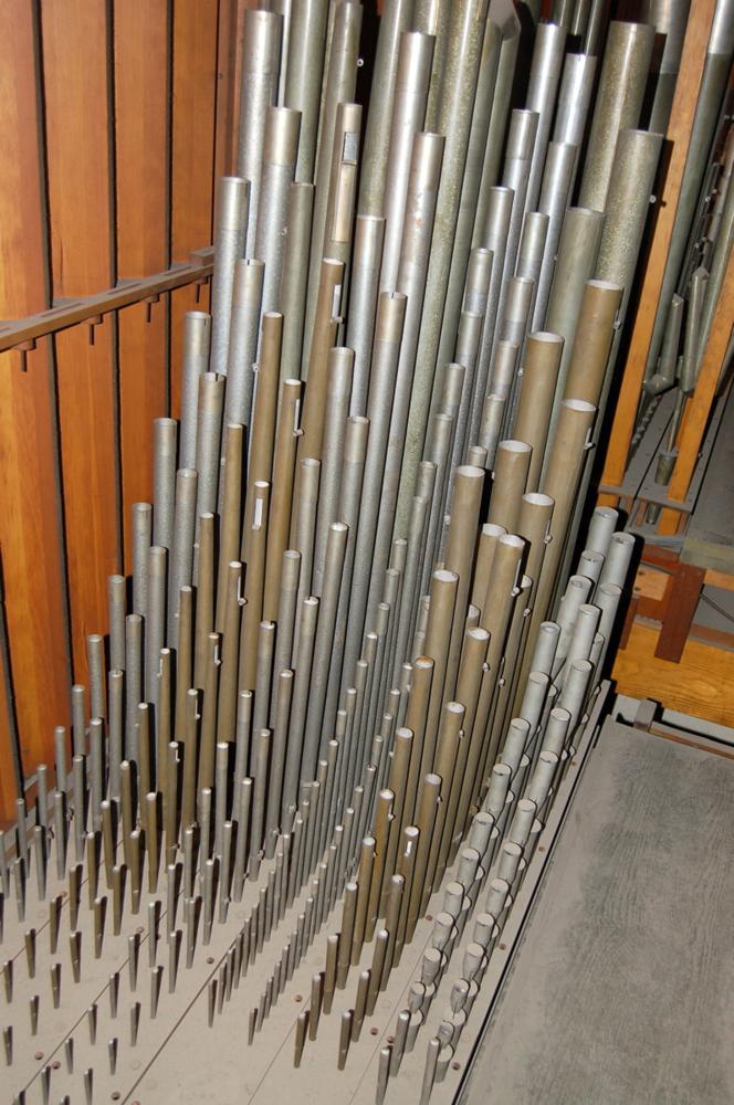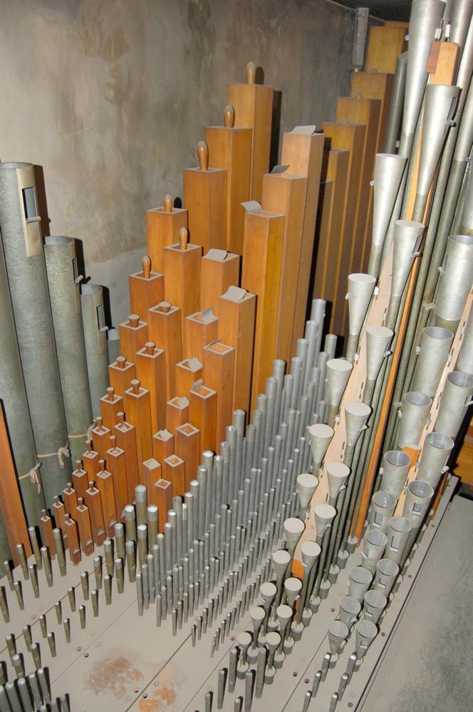 Temporary Klann console in 1971, original in storage. Some work by Joseph Nagle in 1970s. Metal pipes of Echo stolen by 1990. [Same as Public Hall?]